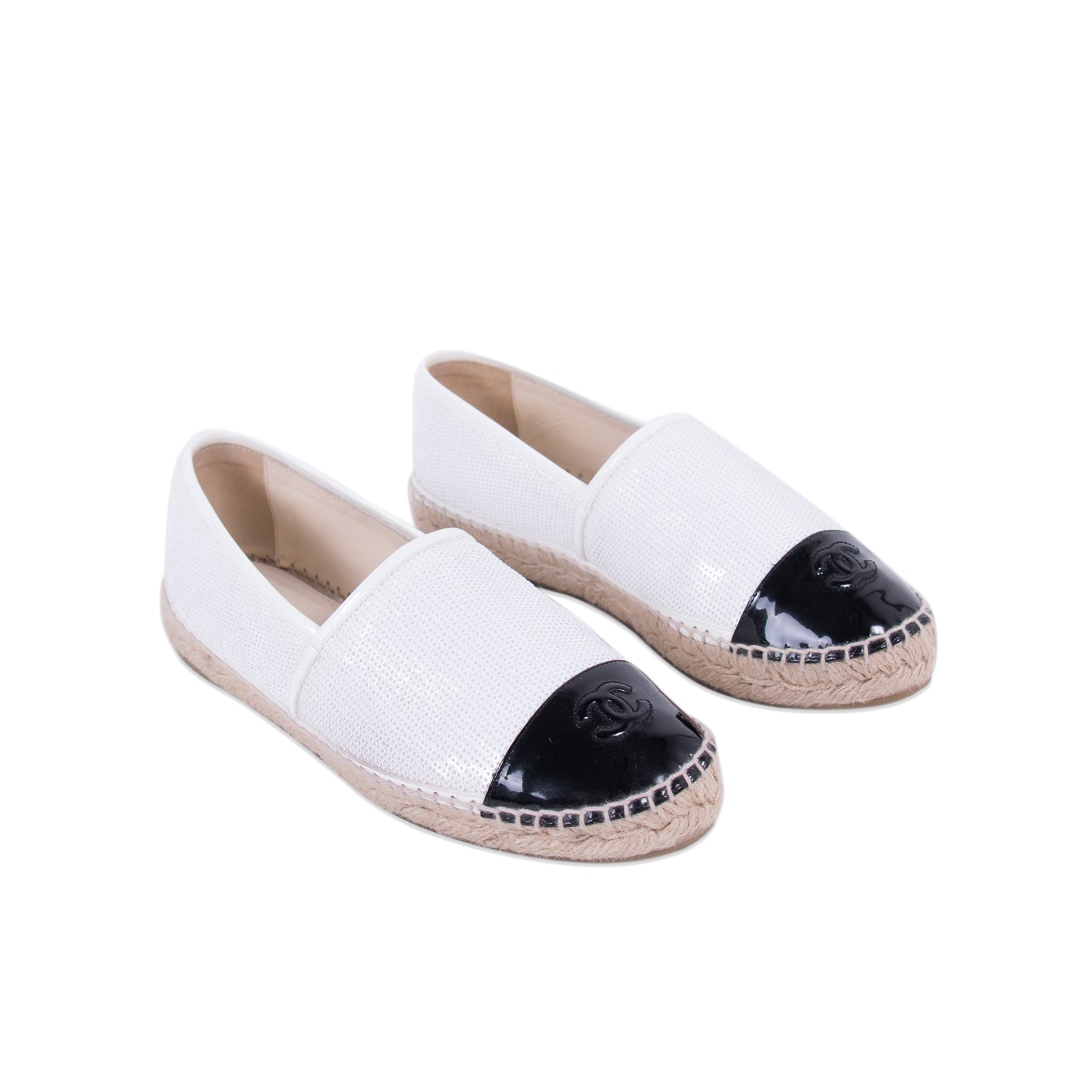Details: Sequin White and Black Patent Leather / Rounded Toe with CC Logo at Front/ Jute Trims / Rubber Sole