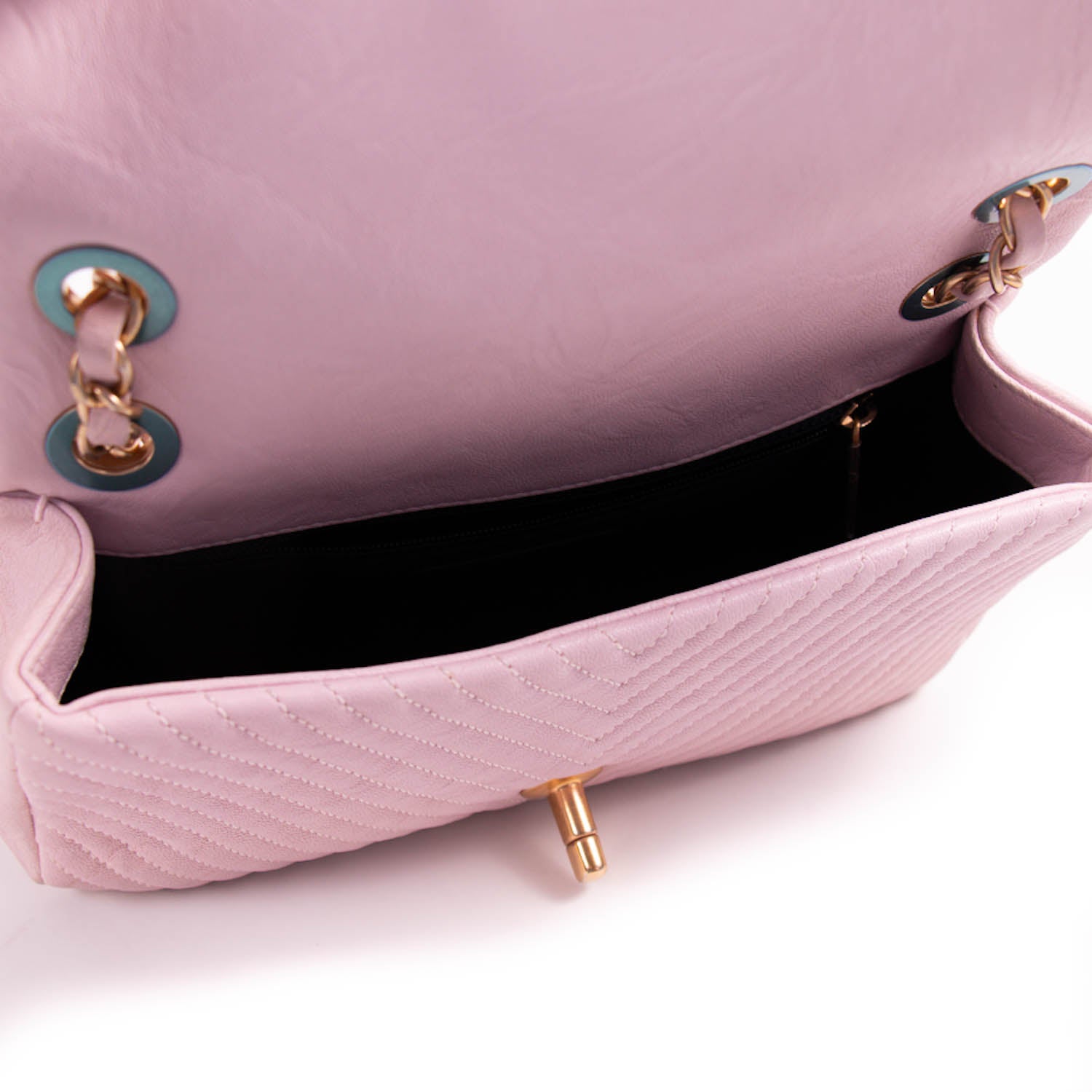 Description: Pink Chevron Quilted Leather / Gold-Tone Hardware / Chain-Link and Leather Shoulder Strap / Single Compartment / Black Fabric Lining / Single Slit Pocket at Inside / Turn-Lock Closure at Front Flap