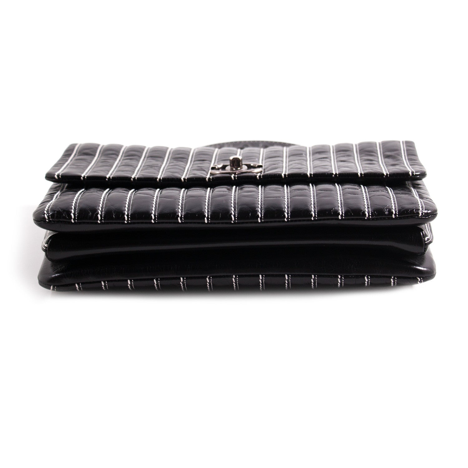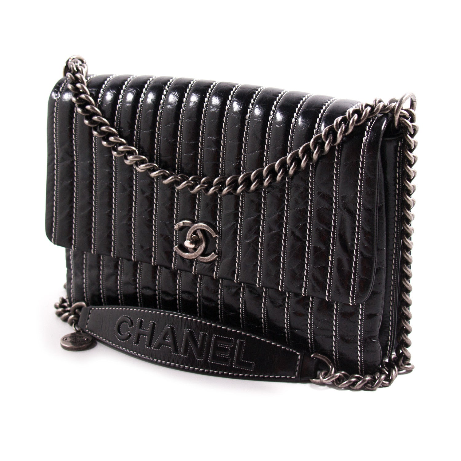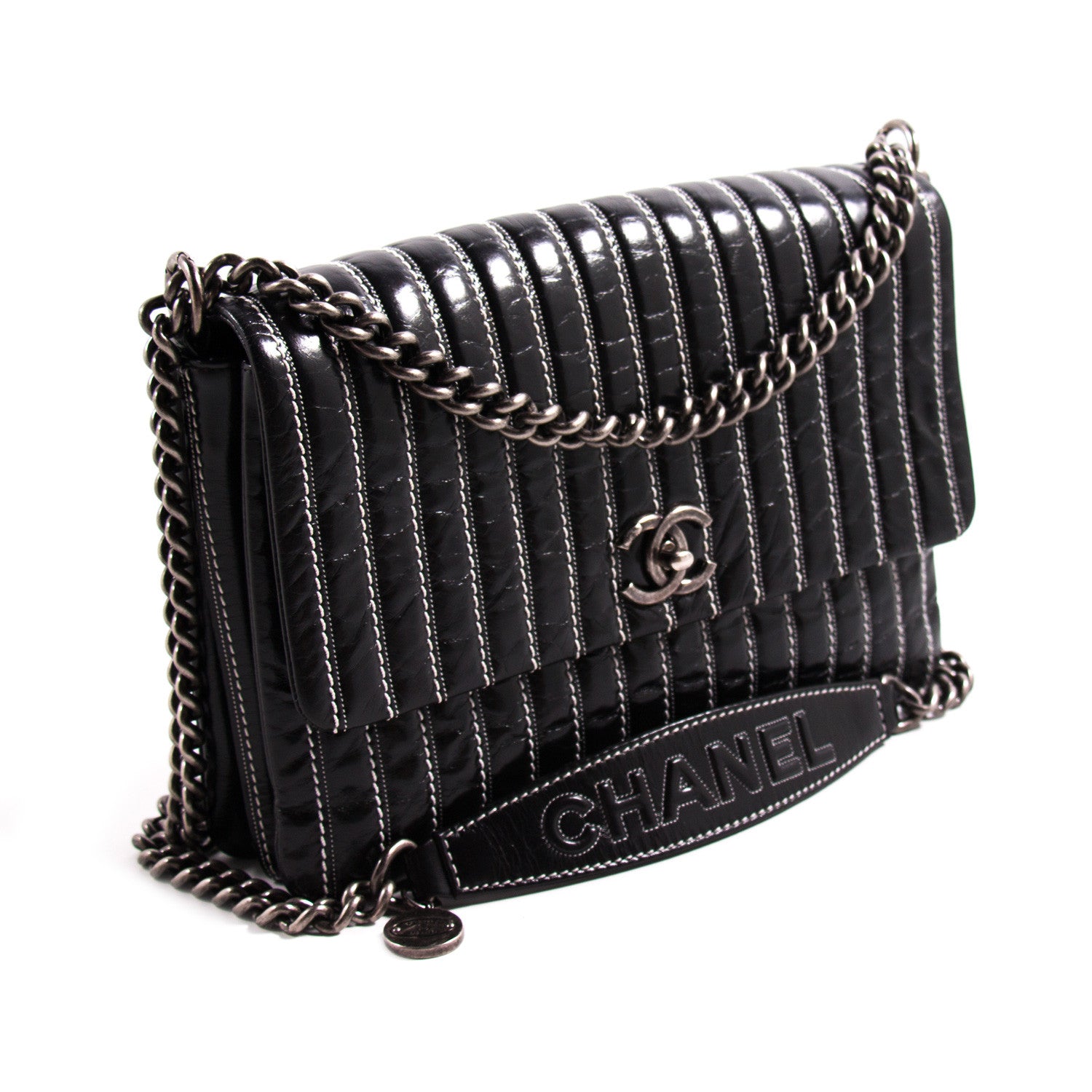 Details: Black Patent Leather / Antiqued Silver Hardware / White Vertical Stitching Pattern / Dual Chain Shoulder Strap With Black Leather Pad / Grey Fabric Interior Lining / Three Compartments / Zip Closure at Interior Wall / CC Turn Lock Closure at Front Flap