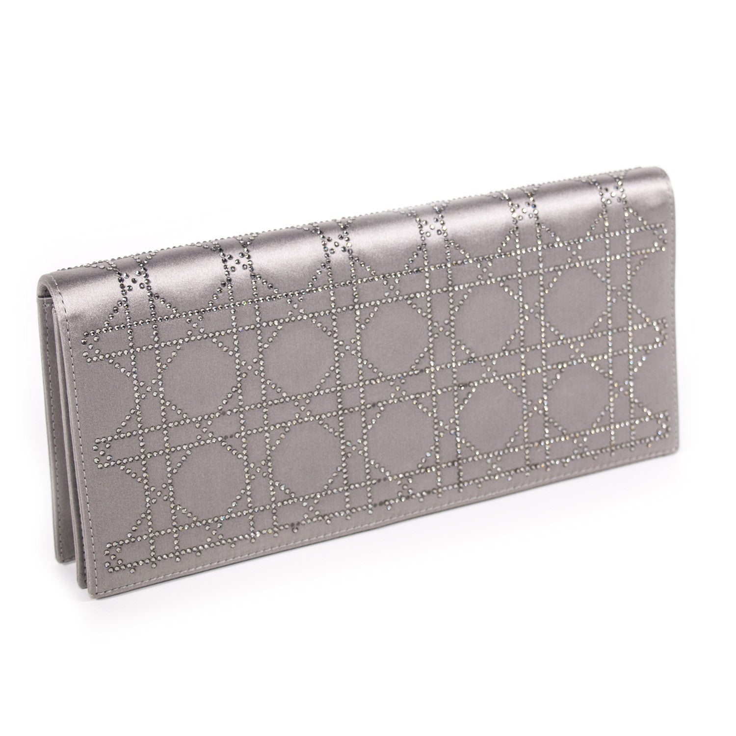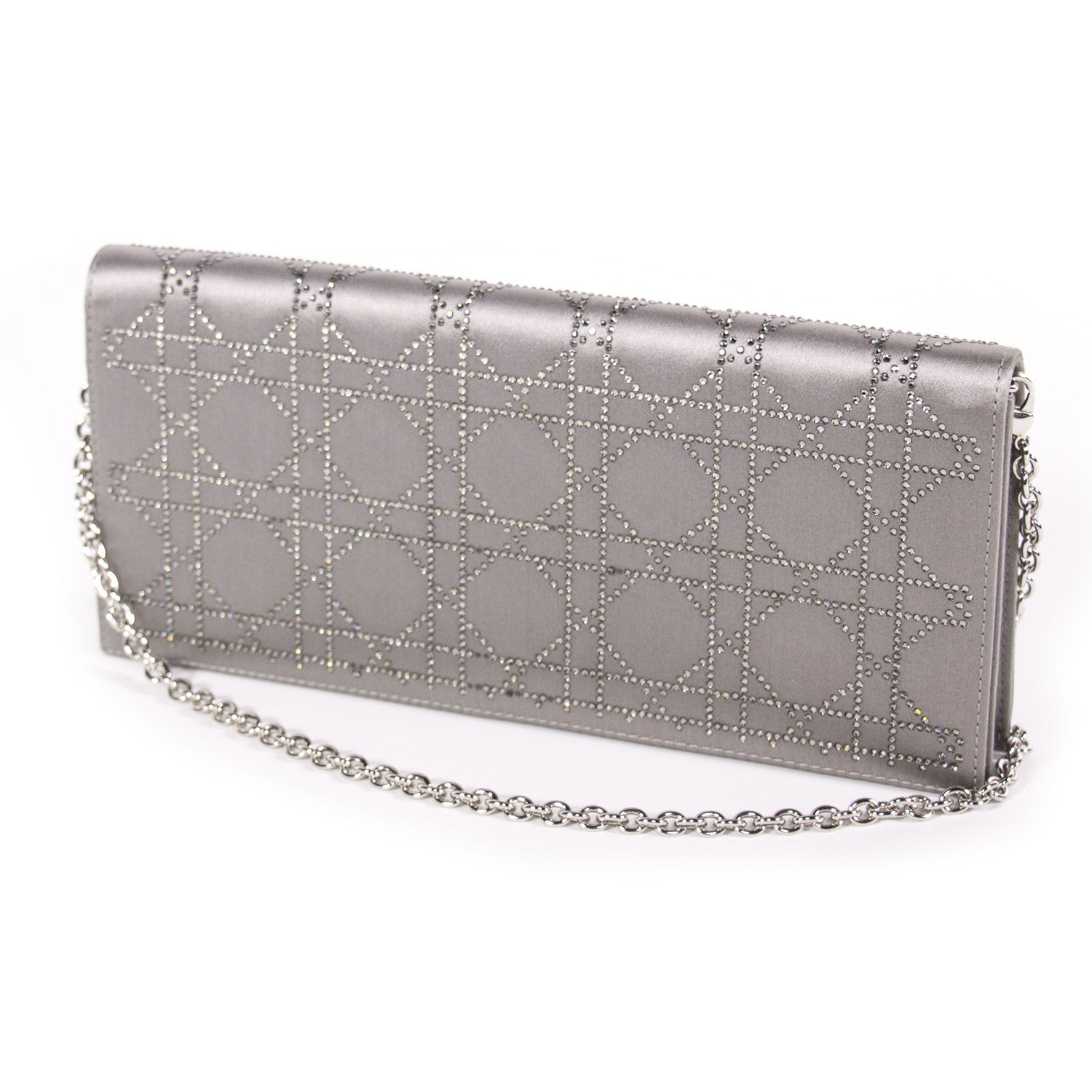 Details: Grey Cannage Satin / Silver Tone Hardware / Crystal Embellishment At Front And Back / Detachable Shoulder Strap / Grey Satin Lining At Interior / Single Compartment / Single Slit Pocket / Magnetic Snap Closure At Front