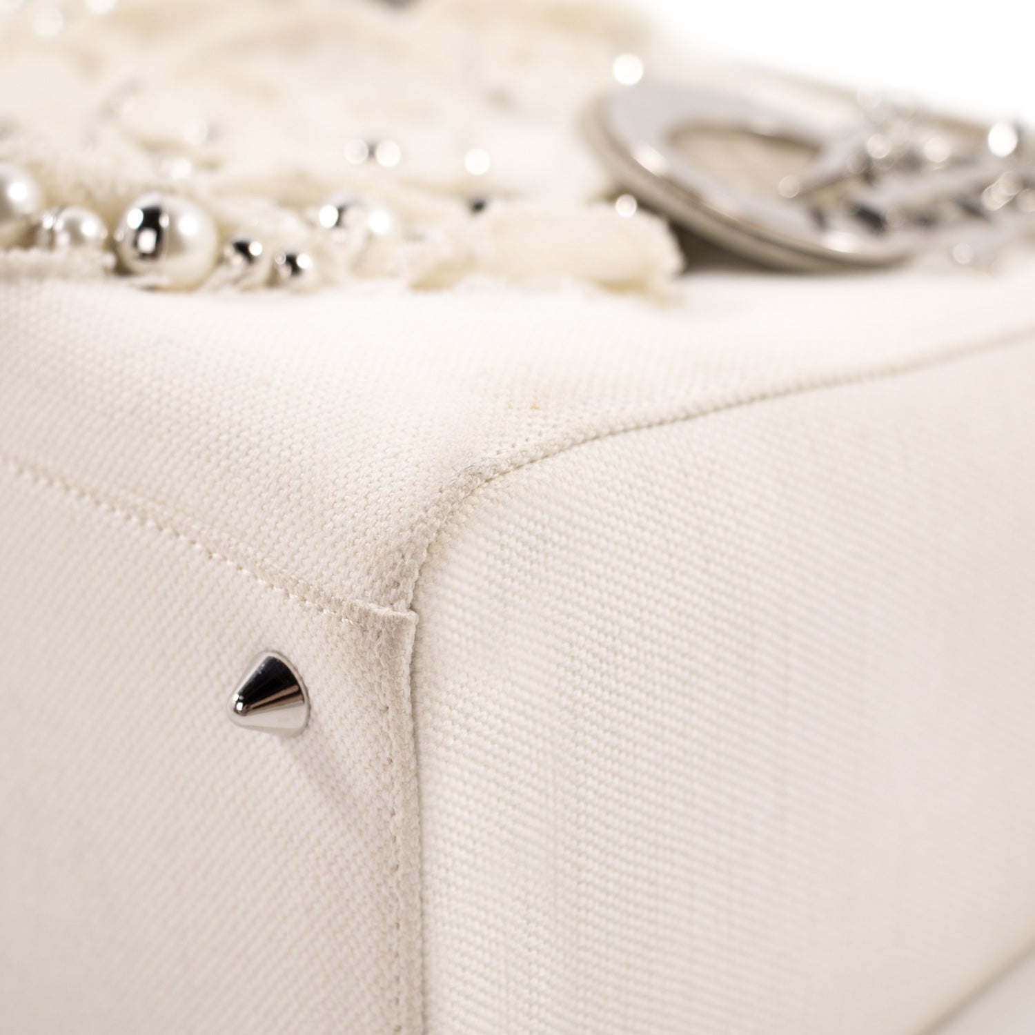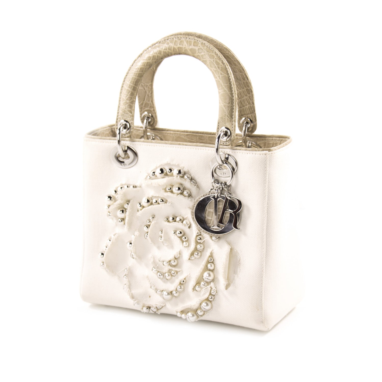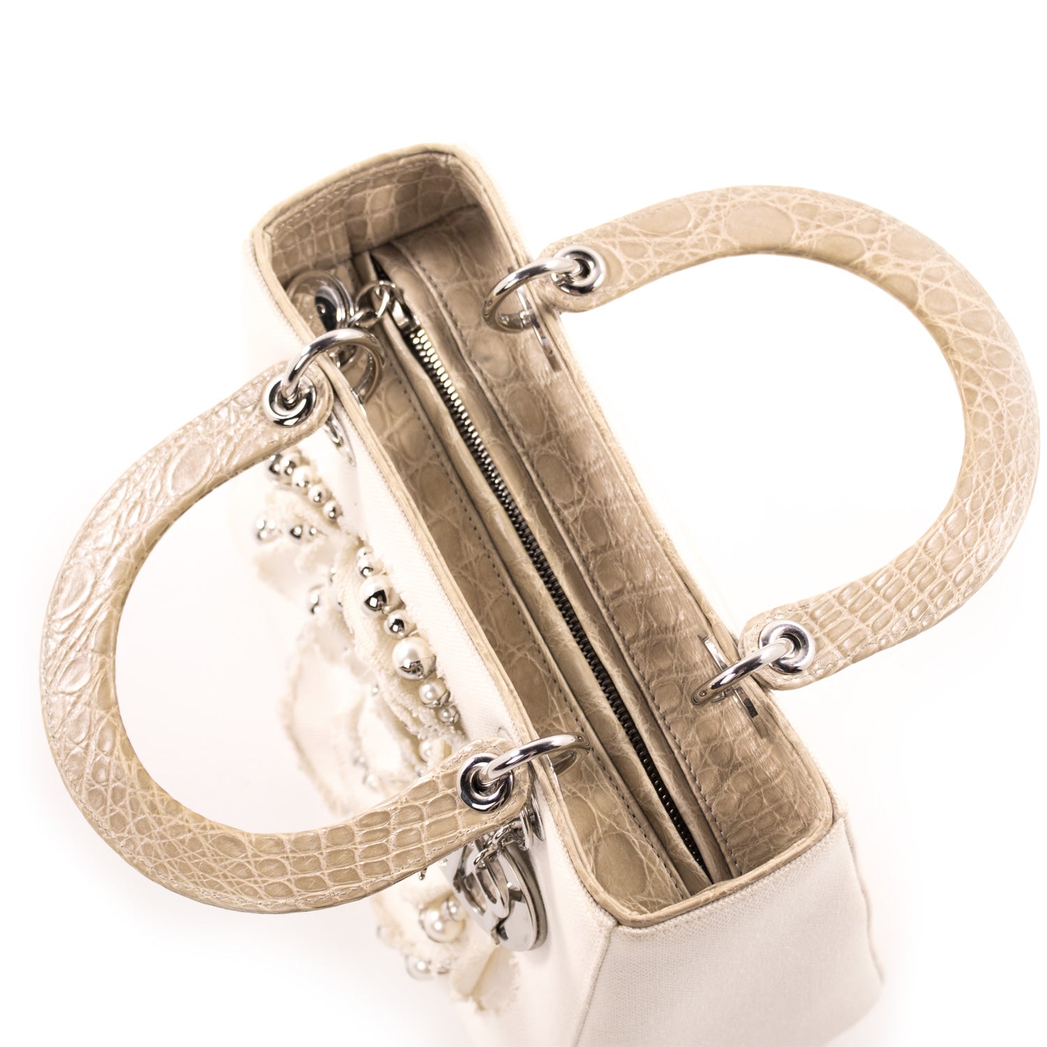 Details: Beige and Beige Canvas with Crocodile Leather / Silver-Tone Hardware / Dual Rolled Handles / Floral Embellishment at Front Face with Mise En Dior Pearl Embroidery / Single Compartment / Zip Pocket at Interior / Zip Closure at Top