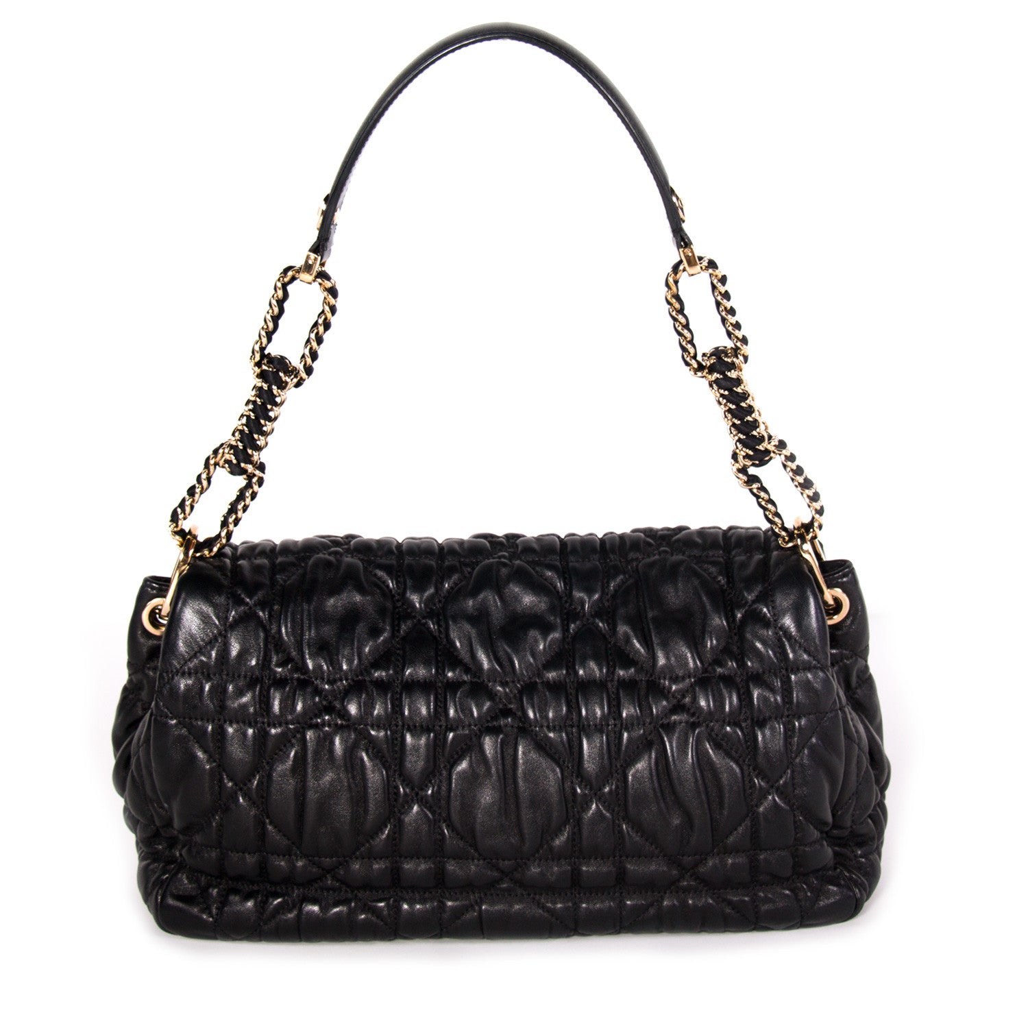 Details: Black Cannage Lambskin Leather / Gold-Tone Hardware / Chain-Link and Leather Shoulder Strap / Black Fabric Interior Lining / Three Compartments / Zip Pocket at Interior Wall / Magnetic Snap Closure at Front Flap