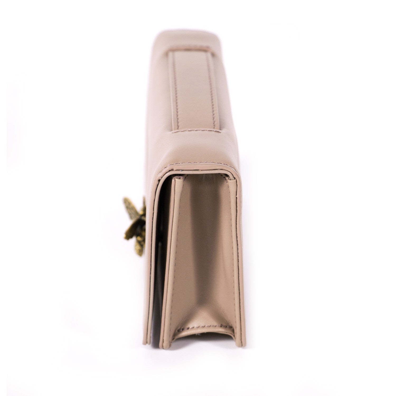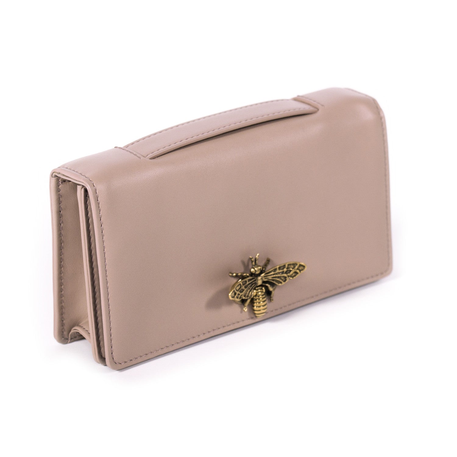 Details: Nude Calfskin Leather / Brass Hardware / Bee Embellishment At Front Face / Top Handle / Single Compartment With Single Slit Pocket / Flip Lock Closure At Front Flap
