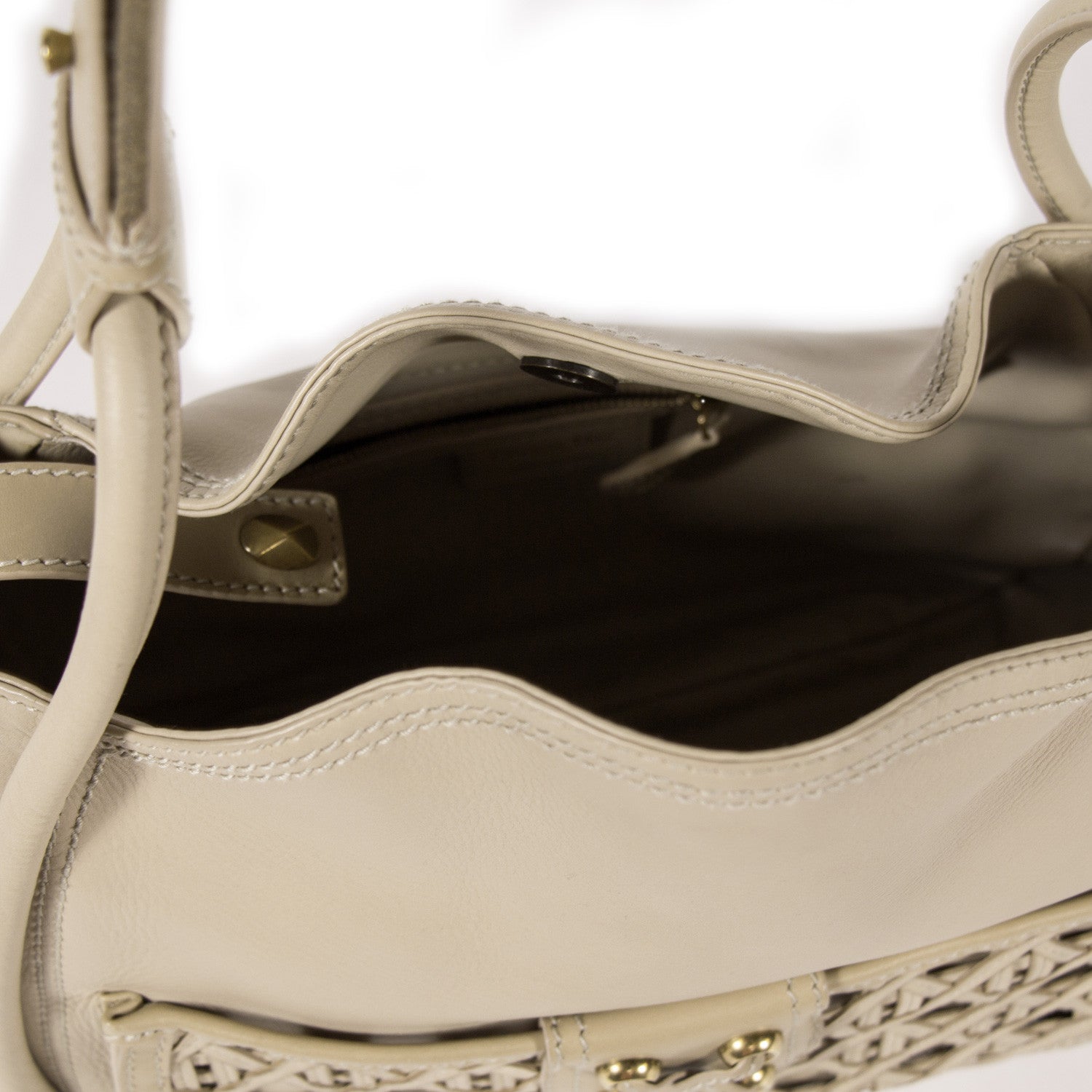Details: Beige Calfskin Leather / Brass Hardware / Tonal Stitching / Grey Woven Accent At Base And Edges / Dual Rolled Handles / Detachable Adjustable Shoulder Strap With Metal / Exterior Pocket At Front With Snap Closure / Leather Interior Lining / Dual Pockets One With Zip Closure / Snap Closure At Top