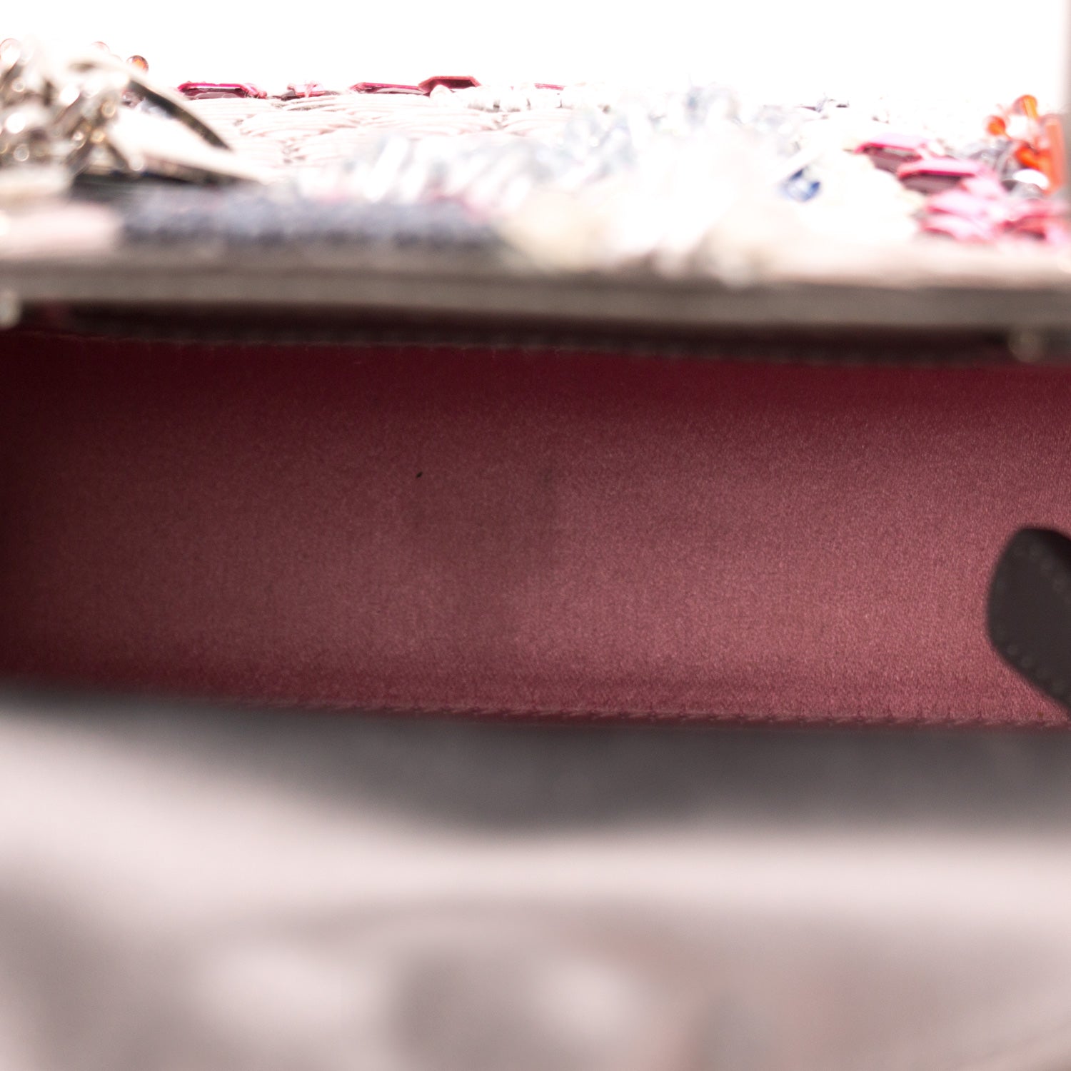 Details: Grey Satin with Red, Blue and White Abstract Bead and Sequin Embellishments Throughout / Silver-Tone Hardware / Dual Rolled Handles / Detachable Shoulder Strap / Pink Satin at Interior / Zip Pocket at Inside / Flap Closure at Top