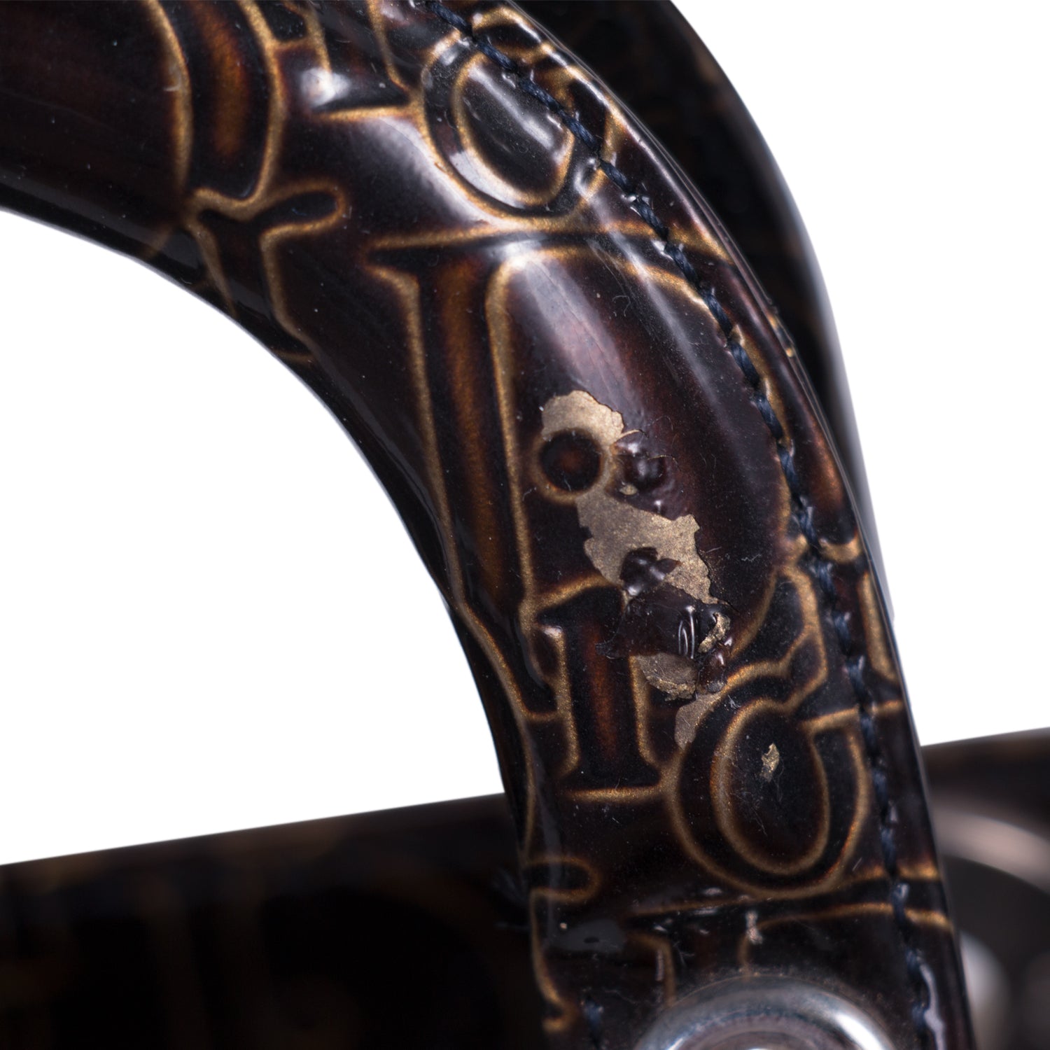 Details: Black and Gold Patent Leather with Logo Prints Throughout / Silver-Tone Hardware / Dual Rolled Handles / Detachable Shoulder Strap / Logo Charm at Front / Black Fabric Interior Lining / Flap Closure at Top