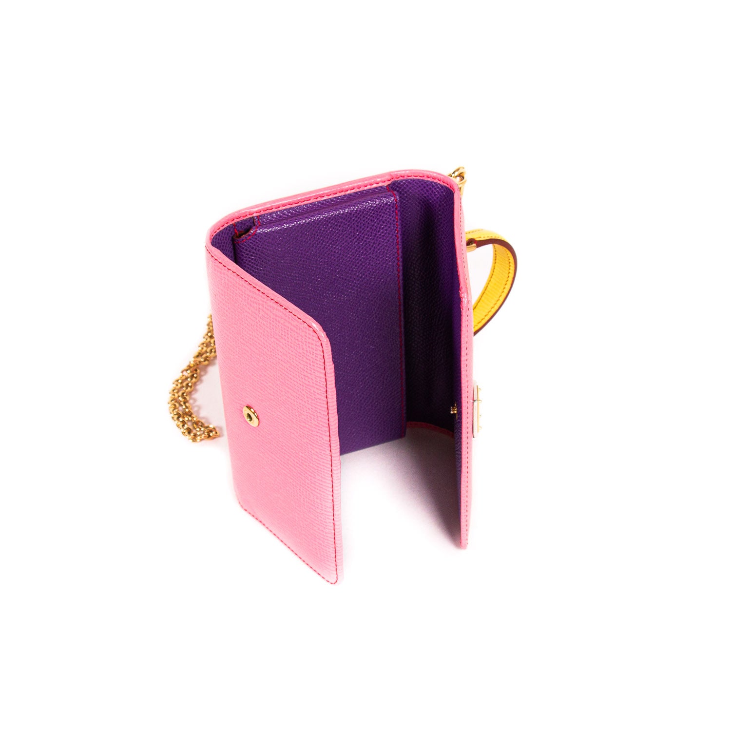 Details: Pink, Purple and Yellow Leather / Gold Tone Hardware / Detachable Chain Link Shoulder Strap / Purple Leather Lining / One Phone Pocket, One Bill Compartment, Five Card Slot / Fold-Over Push Button Closure