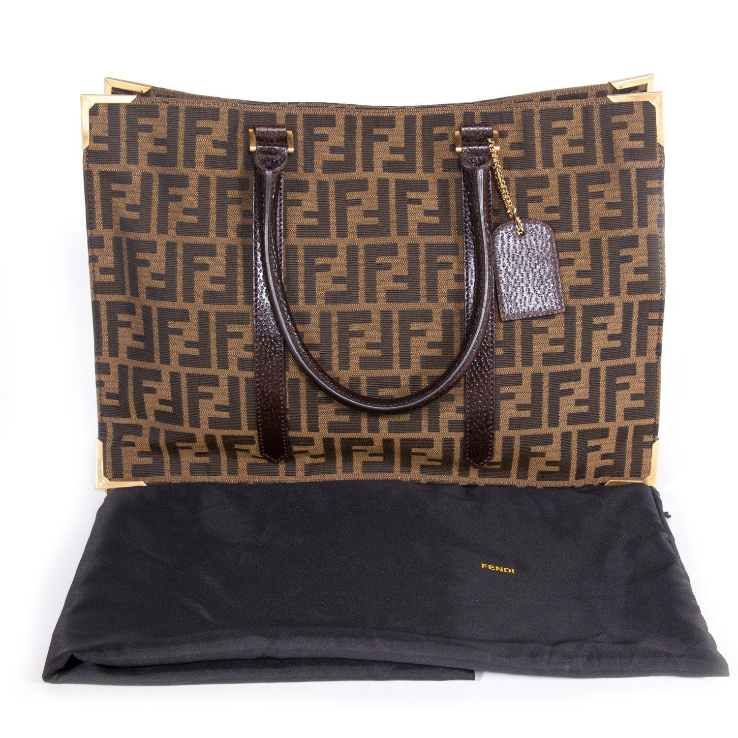 Details: Brown Canvas With The Signature Zucca Pattern / Gold Tone Metal Framing On Edges / Brown Leather Trim / Dual Rolled Handles / Brown Leather Interior Lining / Three Compartments, One With Zip Closure / Open Top / Removable Fendi No. 4 Tag