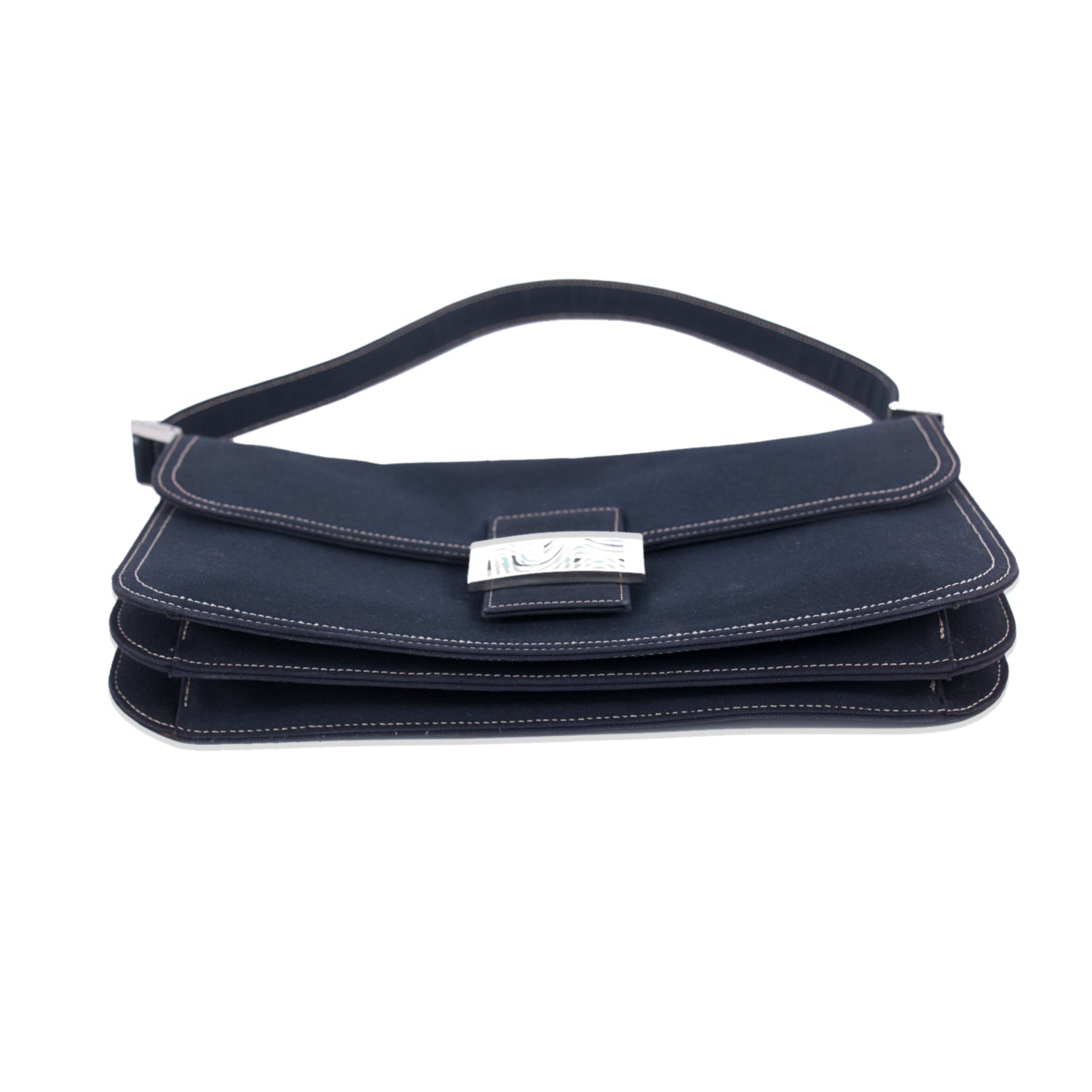 Details: Navy Blue Denim Fabric / Silver-Tone Hardware / Single Shoulder Strap / Magnetic Snap Closure at Front / Dual Compartments at Interior / Zipper Pocket at Inside