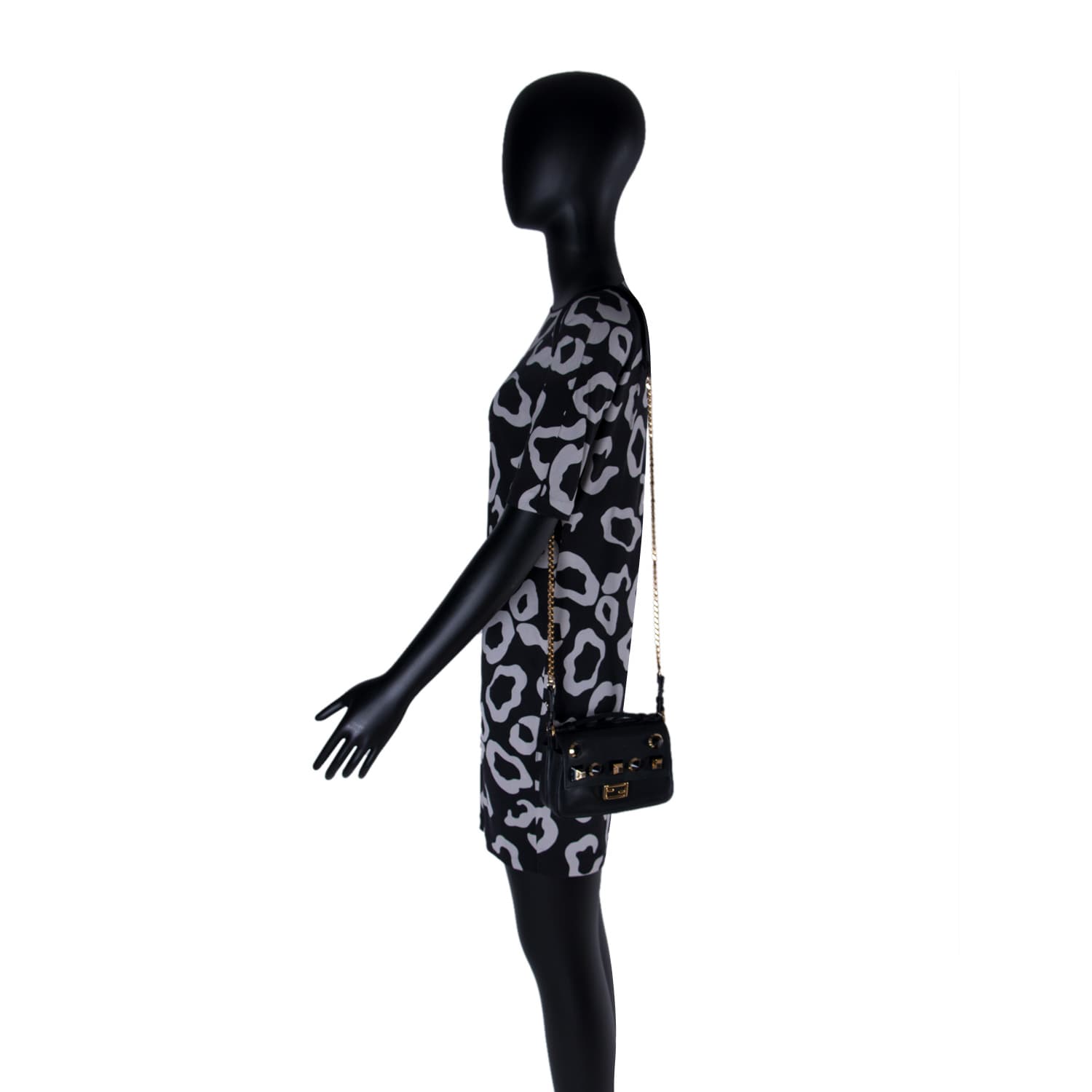 Details: Black Leather / Gold-Tone Hardware / Embroidery at Front / Detachable Shoulder Strap / Single Handle / Dual-Sided Compartments / Suede Interior Lining / Flat Pocket at Inside / Magnetic Snap Closure