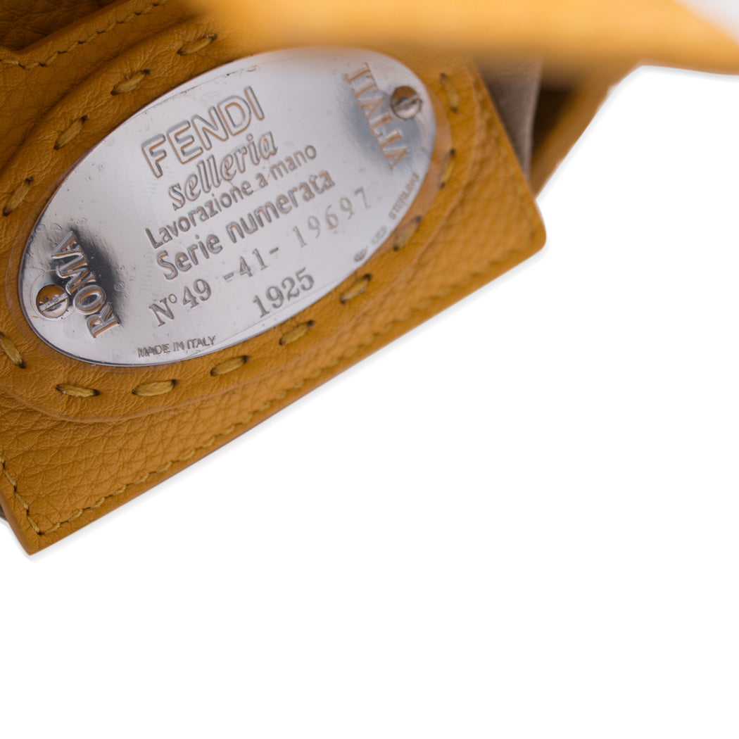 Details: Yellow Grained Leather / Silver-Tone Hardware / Adjustable Shoulder Strap / Logo at Front / Brown Suede Interior Lining / Zipper and Flat Pocket / Magnetic Snap Closure at Flap