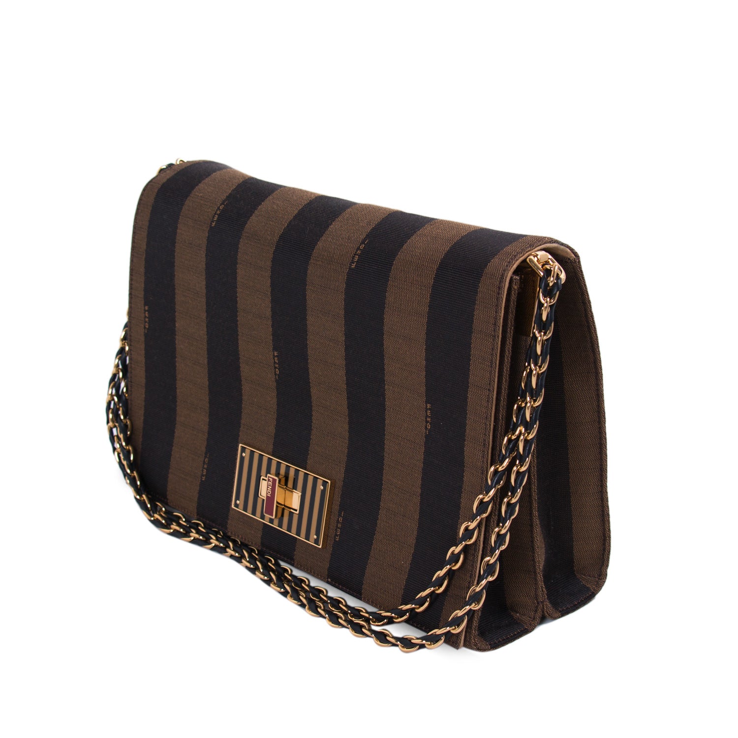 Details: Brown and Tobacco Pequin Canvas / Gold-Tone Hardware / Dual Chain-Link and Leather Shoulder Strap / Tan Suede and Linen Interior Lining / Dual Compartments / Zipper Pocket at Inside / Turn-Lock at Front Flap