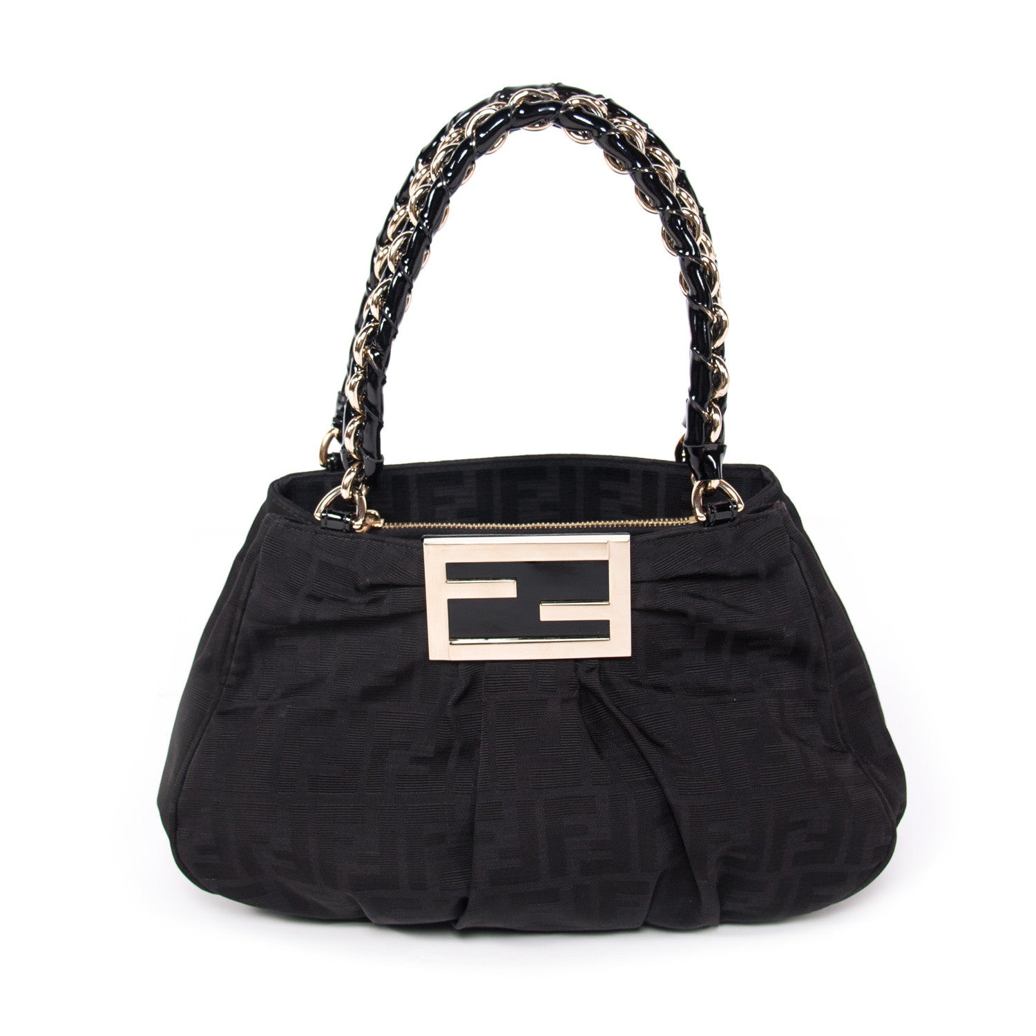 Details: Black Zucca Canvas / Gold-Tone Hardware / Dual Rolled Handles Featuring Chain-Link And Black Patent Leather / Double F Metal Plate At Front Face / Two Large Compartments Featuring Zip Pocket At Center / Slit Pocket At Interior Wall