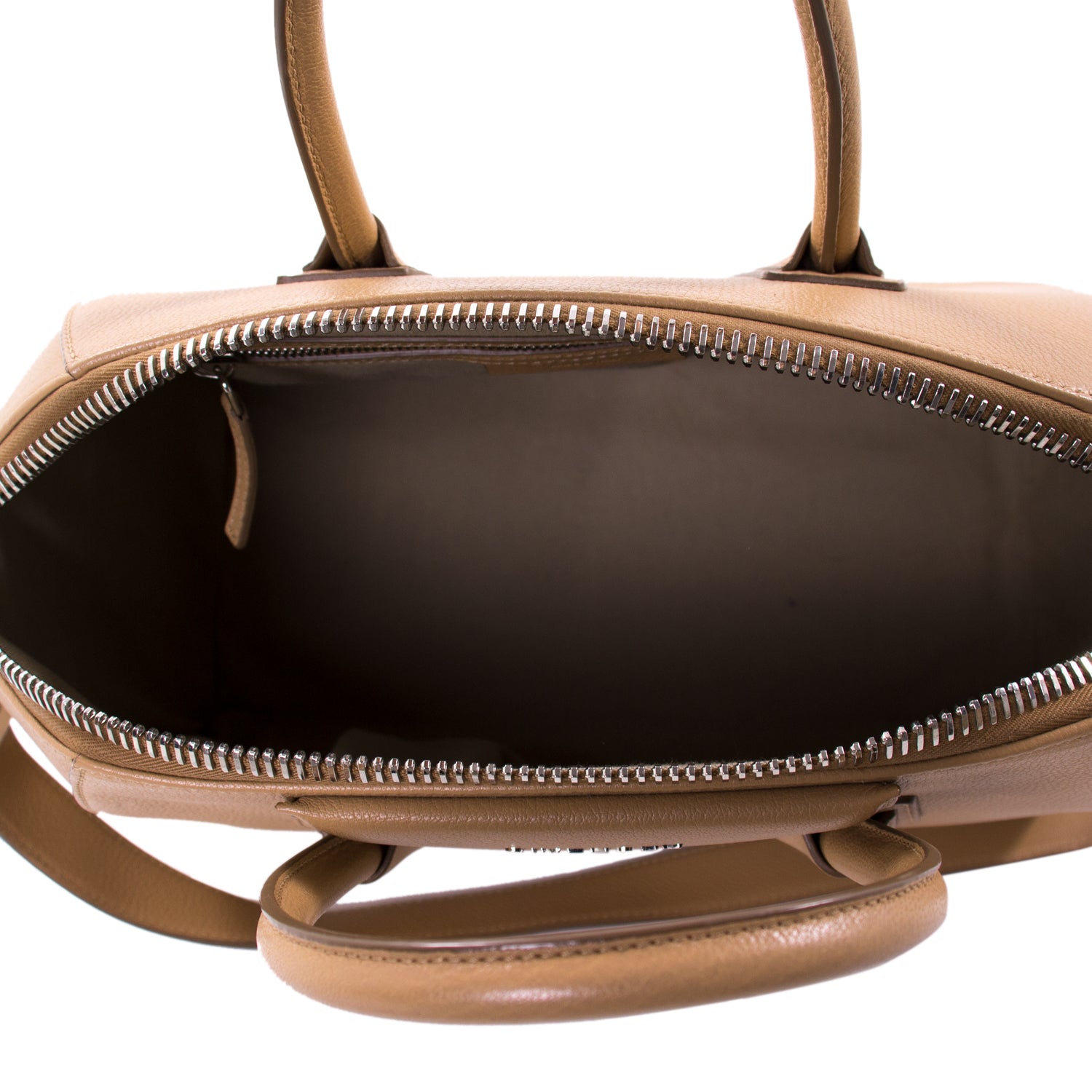 Details: Brown Tan Goatskin Leather / Silver-Tone Hardware / Dual Rolled Handles / Detachable Shoulder Strap / Logo at Front / Beige Fabric Interior Lining / Two Flat Pockets and One Zipper Pocket at Inside / Zipper Closure at Top