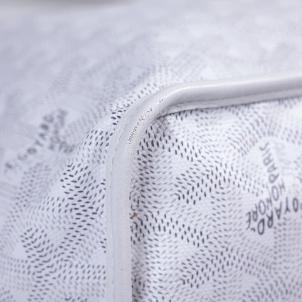 Details: White Goyardine Coated Canvas / Silver-Tone Hardware / Dual Rolled Handles / White Leather Interior / Open Top / Attached Pouch