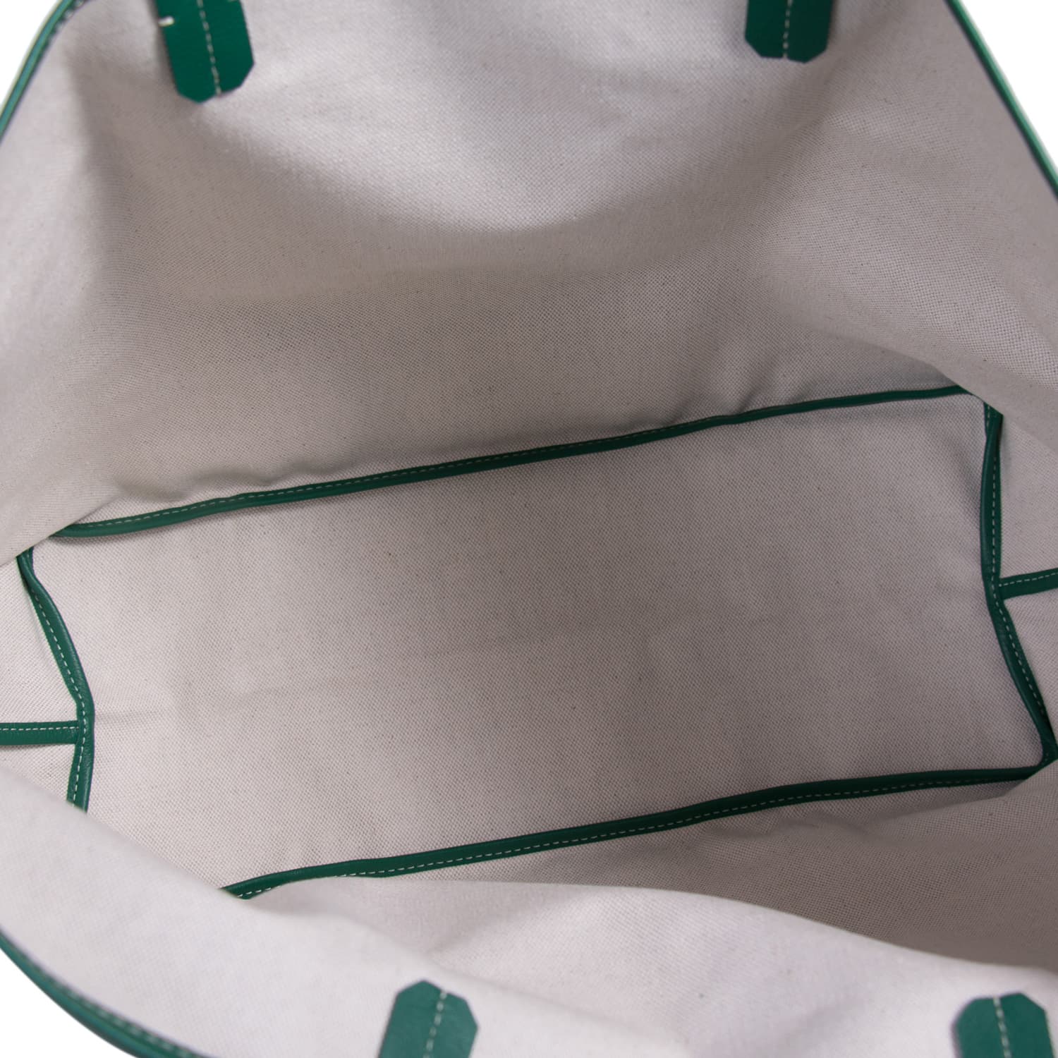 Details: Green, Brown and White Goyardine Coated Canvas / Green Leather Trim / Dual Rolled Handles / Single Compartment / Natural Fabric Lining / Detachable Pocket / Open Top