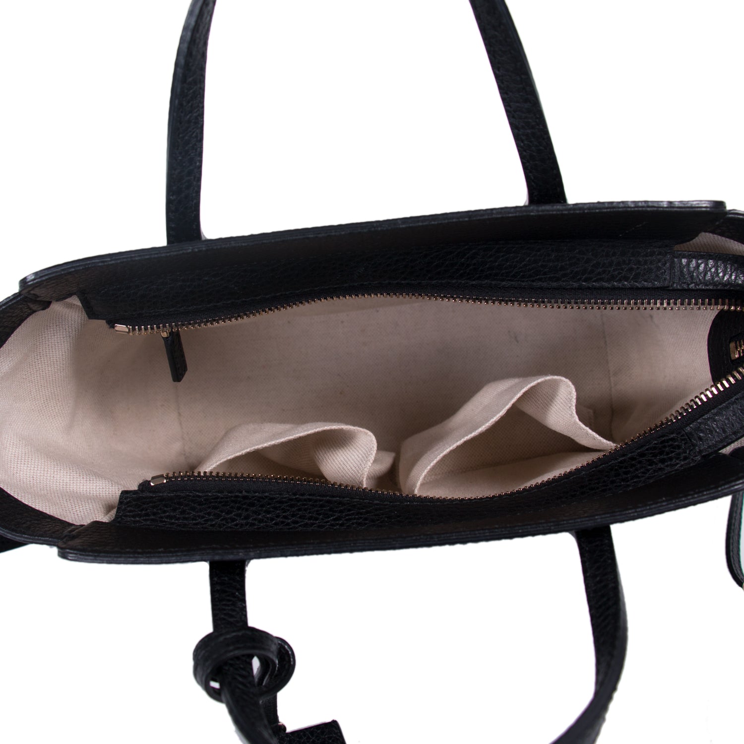 Details: Black Grained Leather / Gold-Tone Hardware / Dual Rolled Handles / Detachable Shoulder Strap / Logo at Front Face / Natural Fabric Interior Lining / Dual Flat Pockets at Inside / Zipper Closure at Top