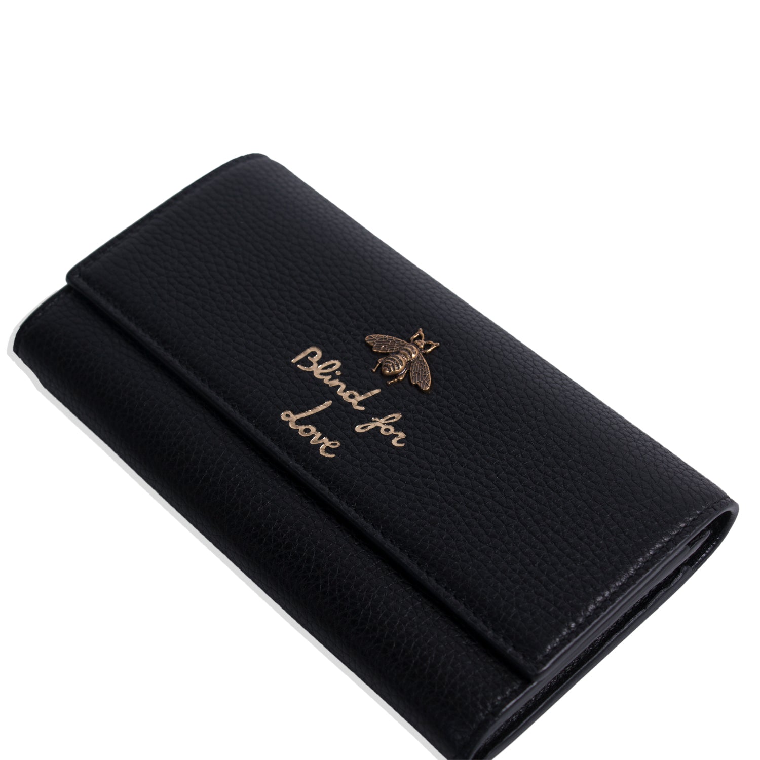 Details: Black Leather / Grass Hardware / Metal Bee Embellishment at Front / Twelve-Card Slots / Three Compartments / Two-Bill Compartments / One Zip Pocket / Snap Closure