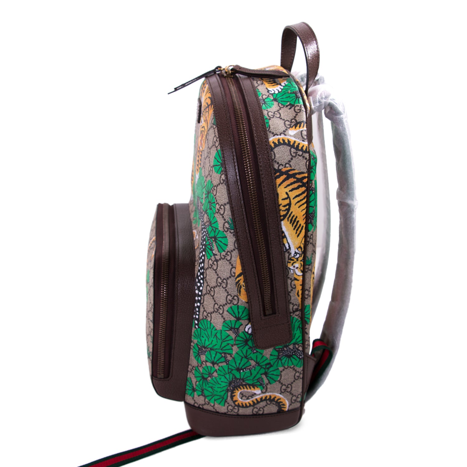 Details: Beige-Ebony GG Supreme Coated Canvas With Gucci Bengal Print / Brown Leather Trim / Embossed Logo Patch At Front Face / Adjustable Signature Green And Red Web Straps / Flat Leather Handle / Brass Hardware / Exterior Zip Pocket At Front Face / Microfiber Lining With Suede Finish At Interior / Interior Pocket For Laptop / Two Smartphone Pocket / Two-Way Zip-Around Closure