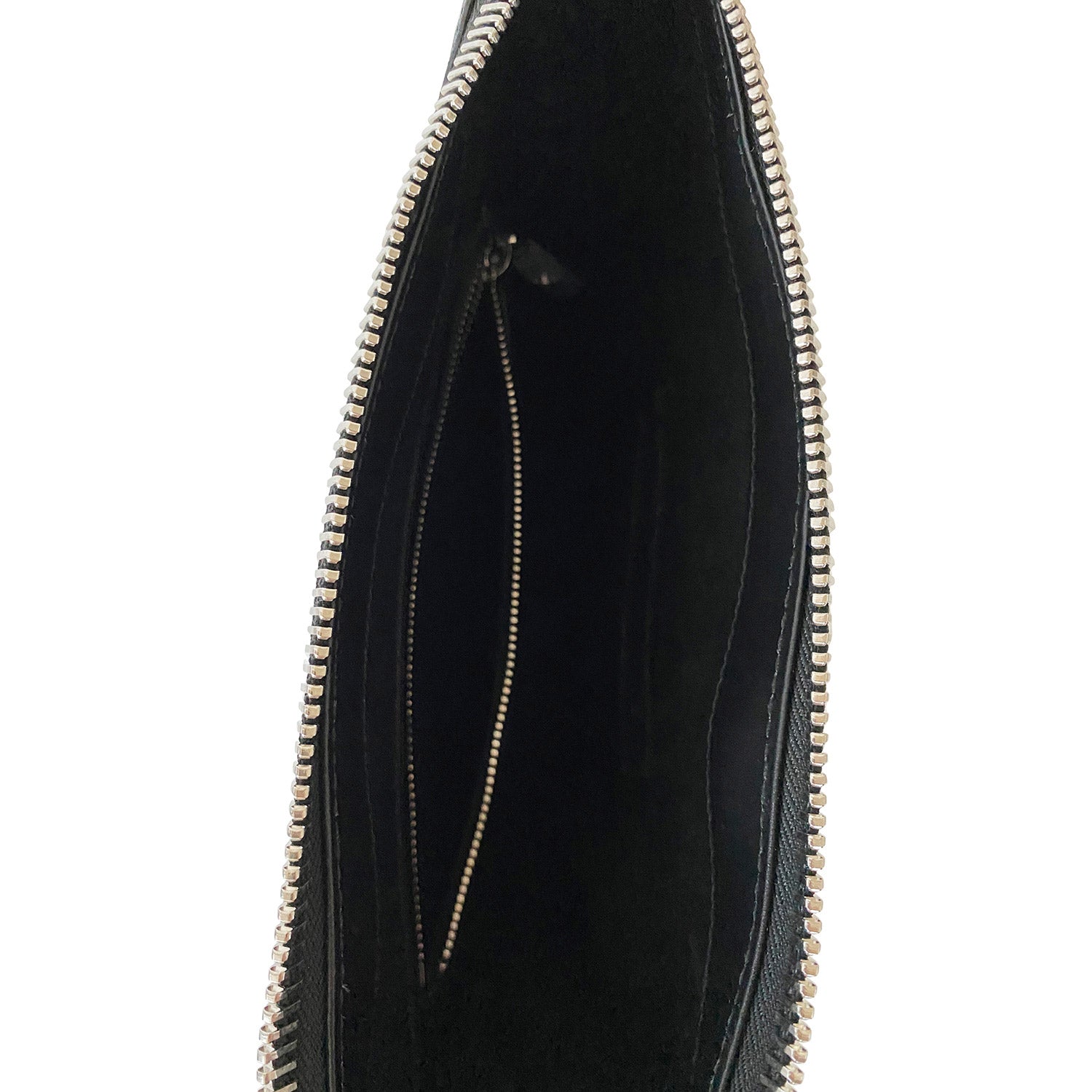 Blue and Red Web Strap with Leather Pad / Exterior Zip Pocket at Front / One Compartment with 2 Slit Pockets and Zipper Pocket / Zipper Closure