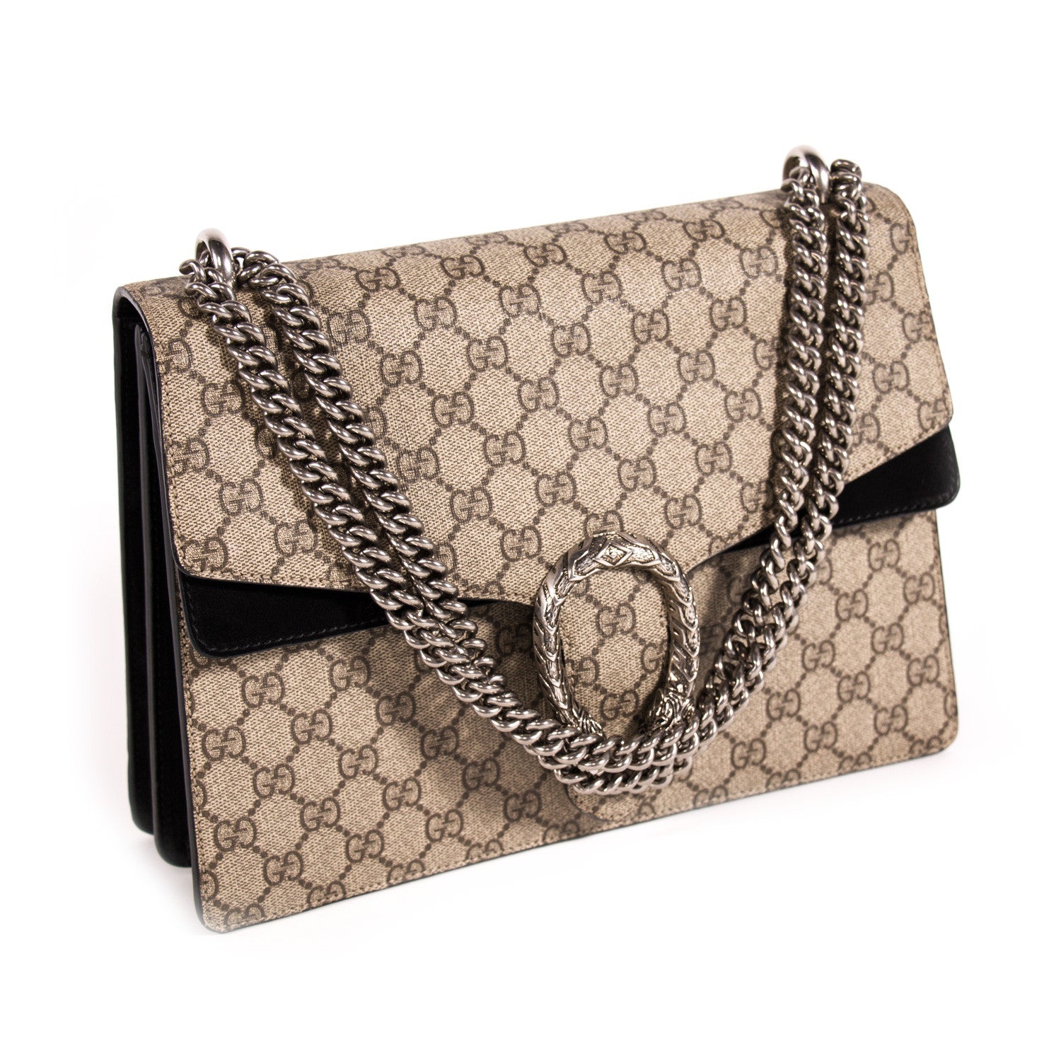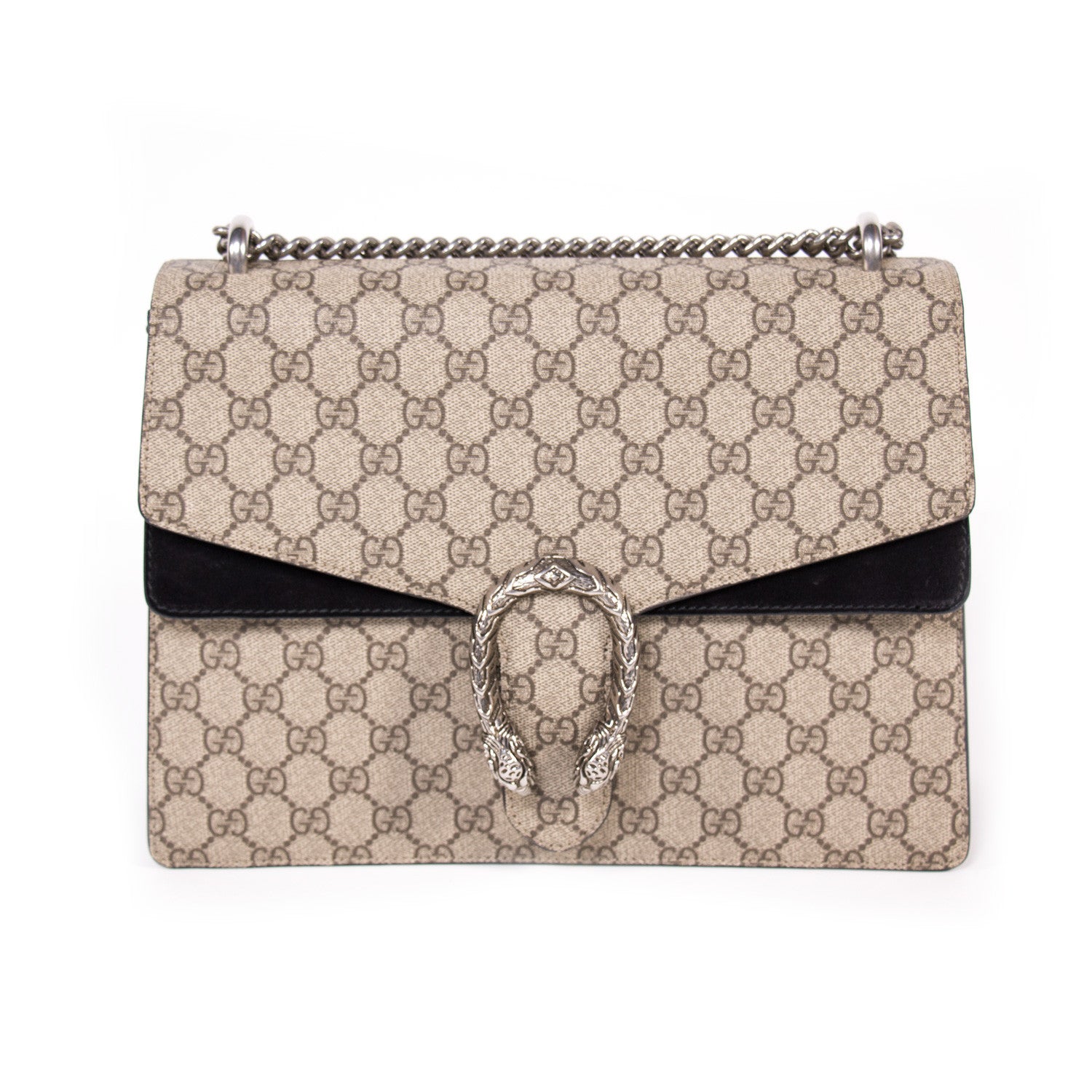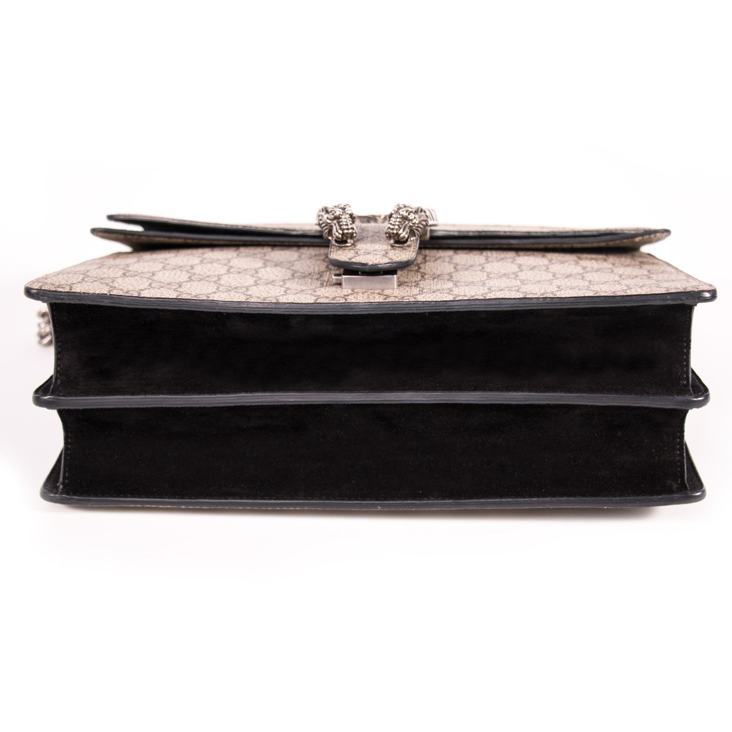 Details: Grey And Brown GG Coated Canvas / Silver-Tone Metal Hardware / Black Suede Accent At Front And Back / Dual Chain Link Shoulder Strap / Flat Exterior Pocket At Back / Single Pocket At Front Flap Underside / Black Suede And Canvas Interior / Three Compartments, One With Zip Closure / Push-Lock Closure At Front Flap / Two-Headed Tiger Adornment