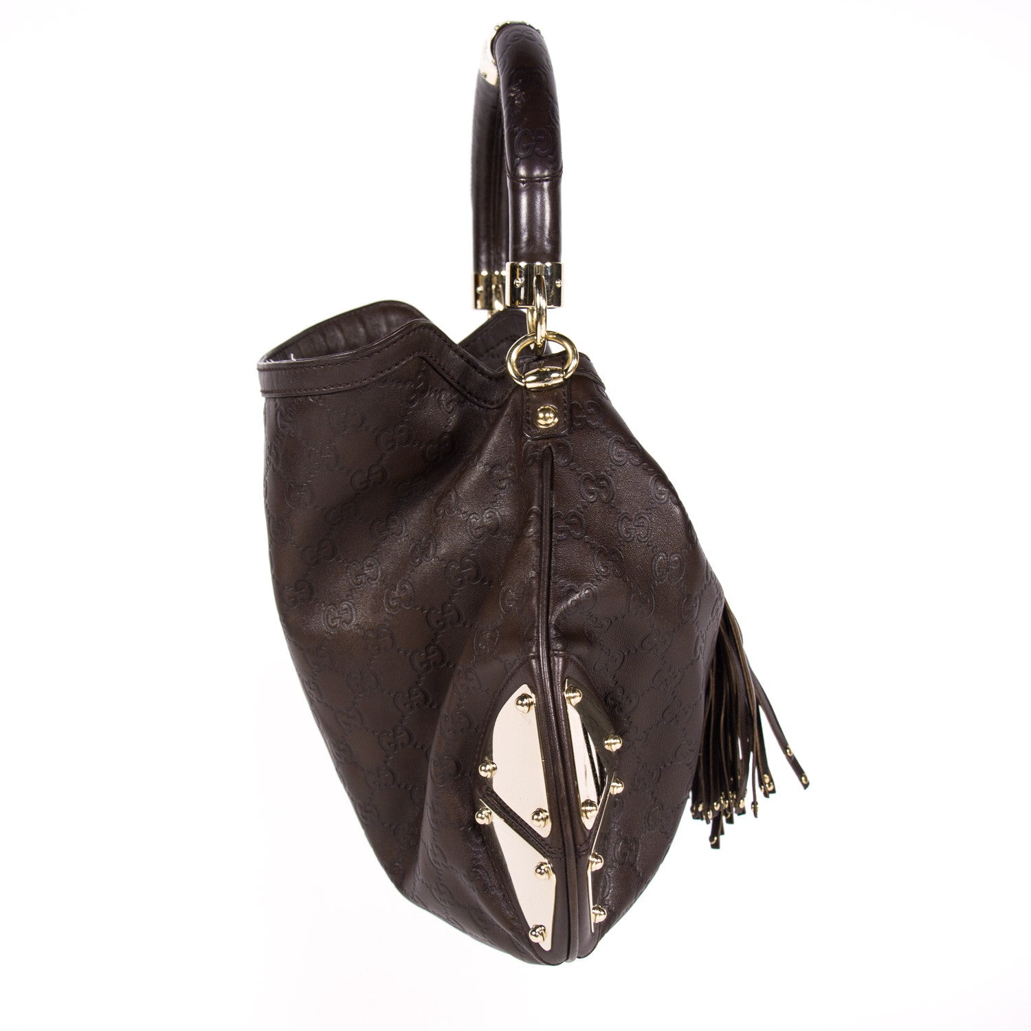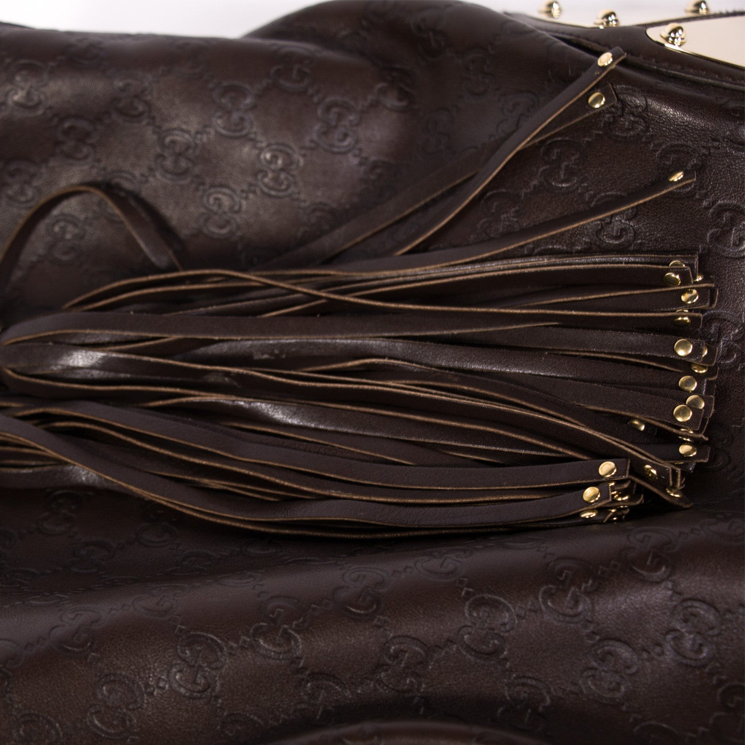 Details: Dark Brown Leather / Gold-Tone Hardware / Single Rolled Handle / Beige Printed Canvas Lining / Single Compartment / Zipper And Phone Pocket At Interior Wall / Front Flap Closure Featuring Bamboo And Tassel Adornment