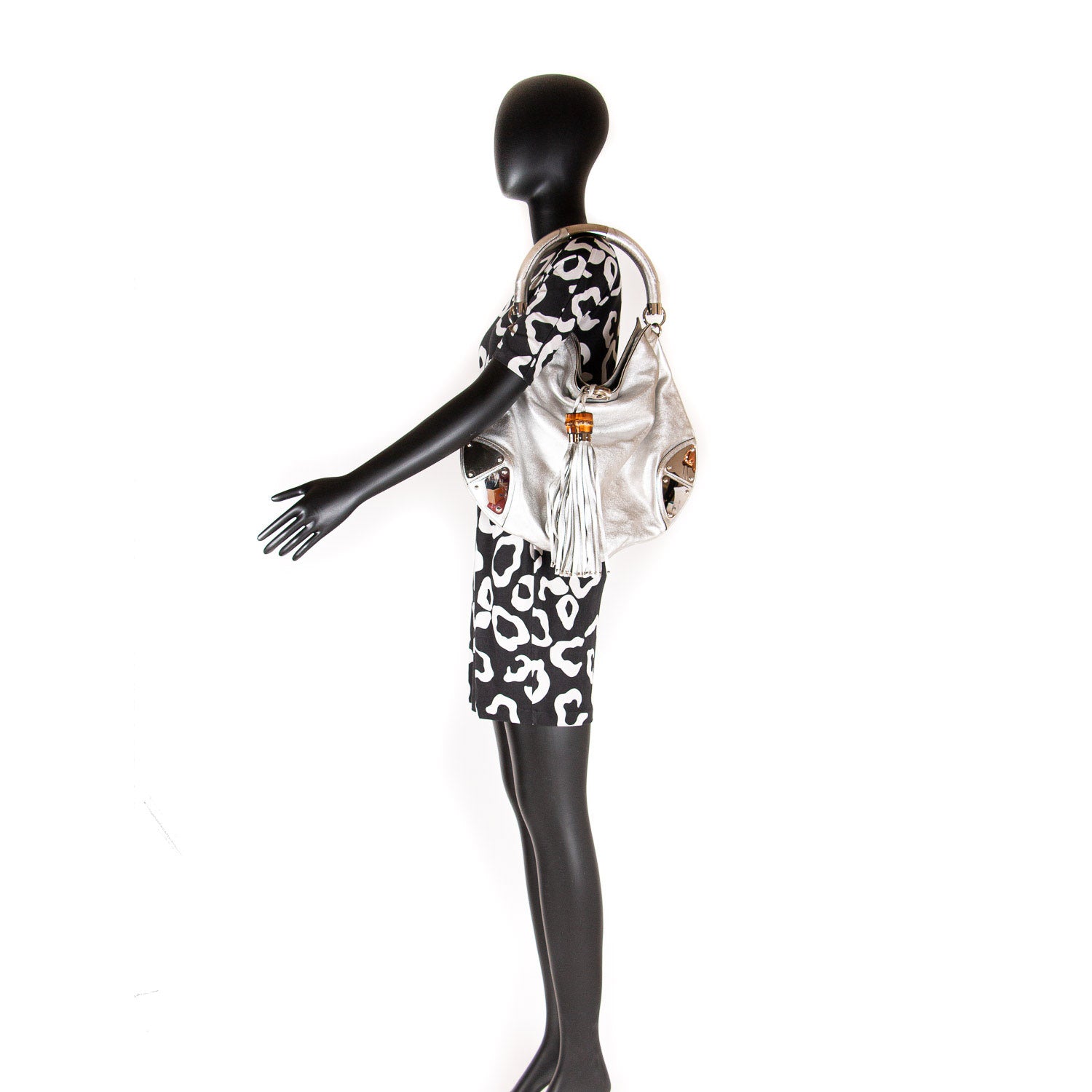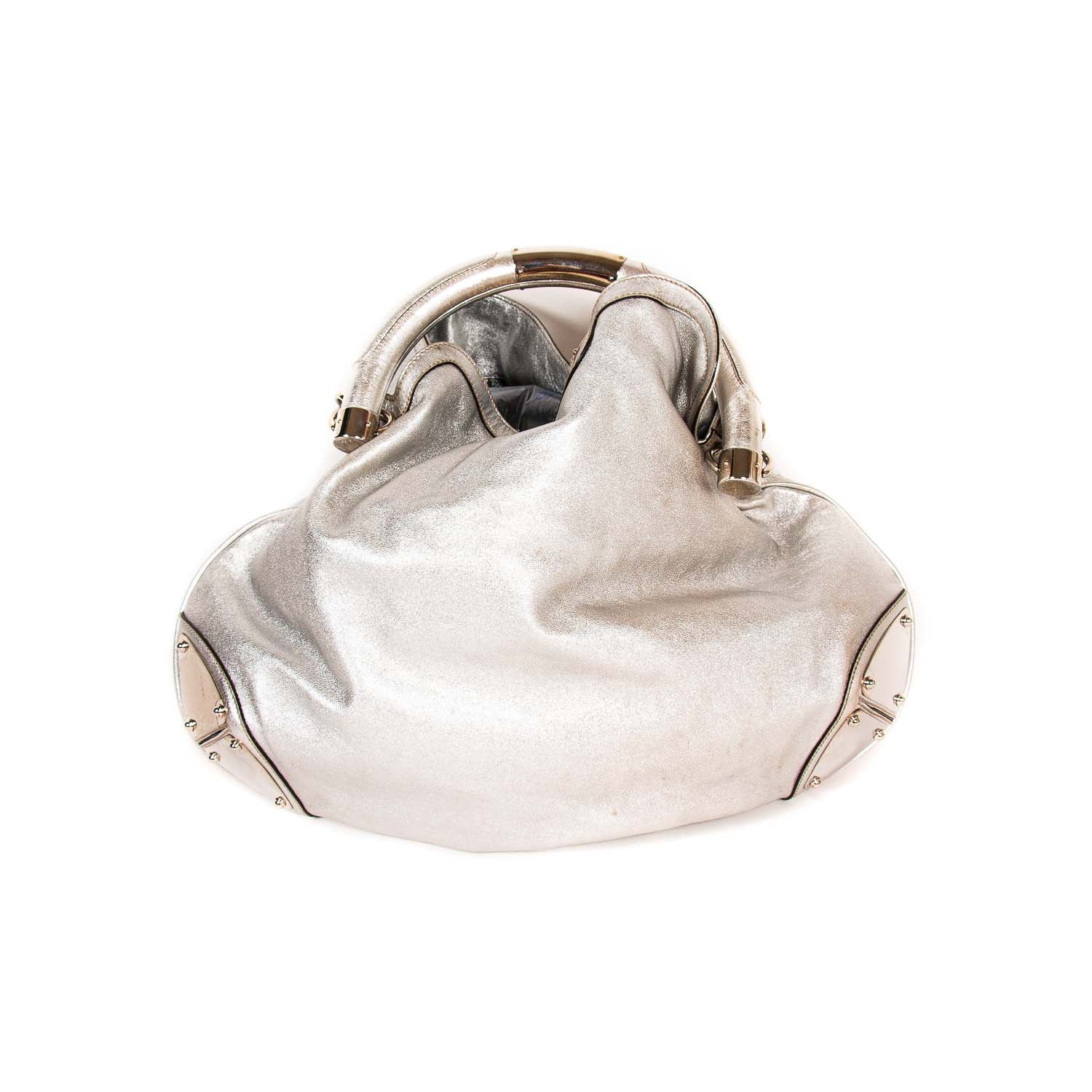 Details: Silver Metallic Leather / Silver-Tone Hardware / Single Rolled Handle / Green Printed Canvas Lining / Single Compartment / Zipper and Phone Pocket at Interior Wall / Front Flap Closure Featuring Bamboo and Tassel Adornment