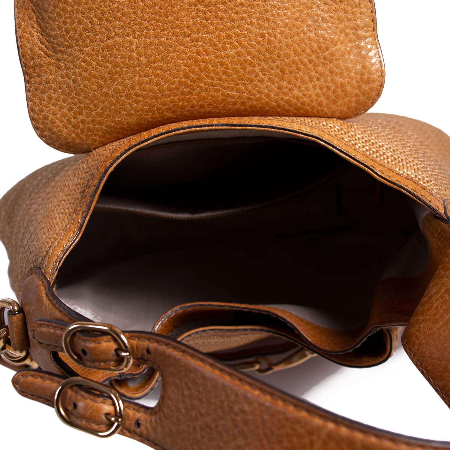 Details: Camel Woven Straw / Gold-Tone Hardware / Tan Leather Trim / Adjustable Top Handle / Braided Shoulder Strap / slit pocket at front flap / Beige Canvas Interior Lining / Single Zipper Pocket at Interior / Fold-in Flap Closure