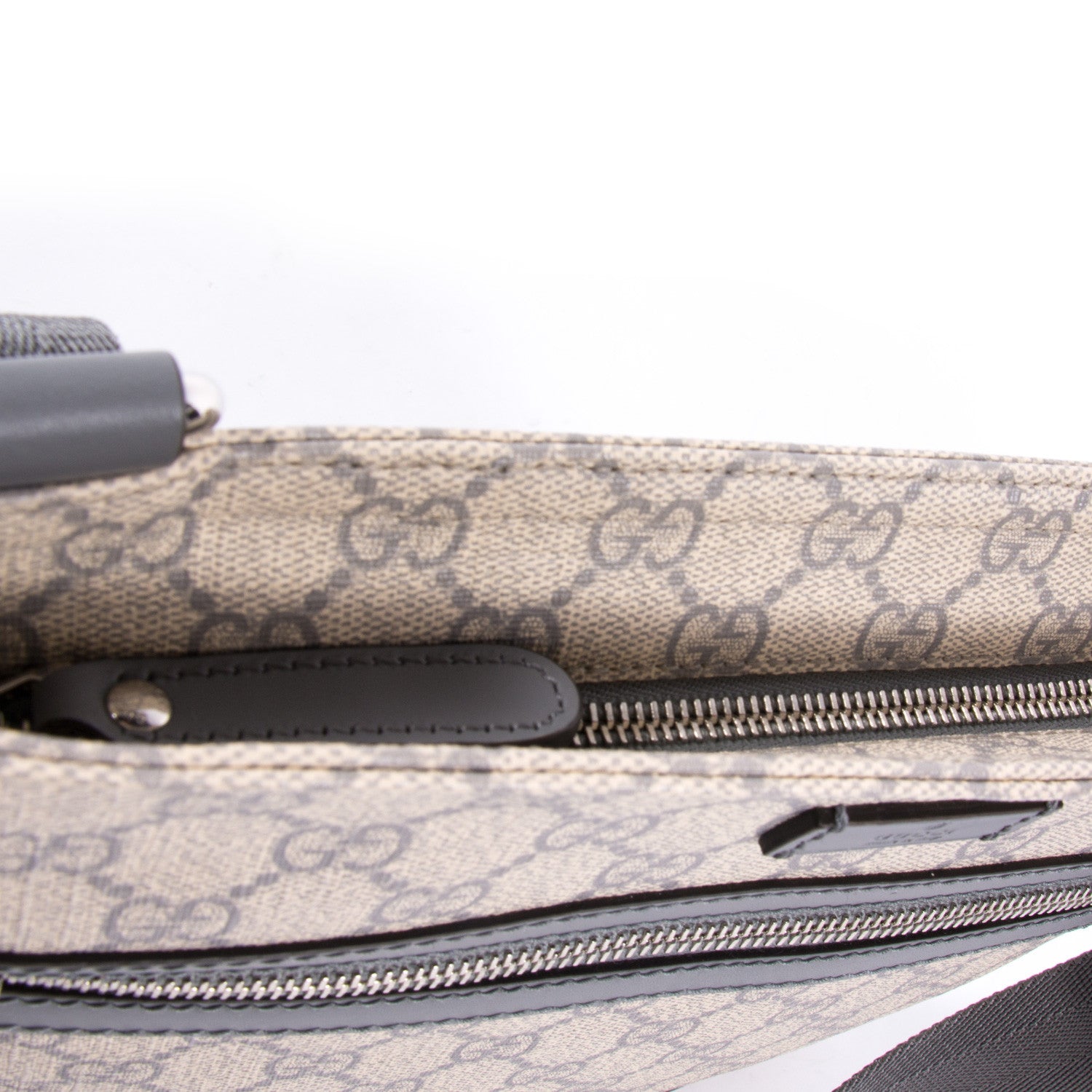 Details: Beige Leather With Grey Leather Trim / Adjustable Flat Shoulder Strap / Exposed External Zip Pocket At Front Face / Woven Interior Lining / One Large Compartment With Slit Pocket At Interior Wall / Zip Closure At Top