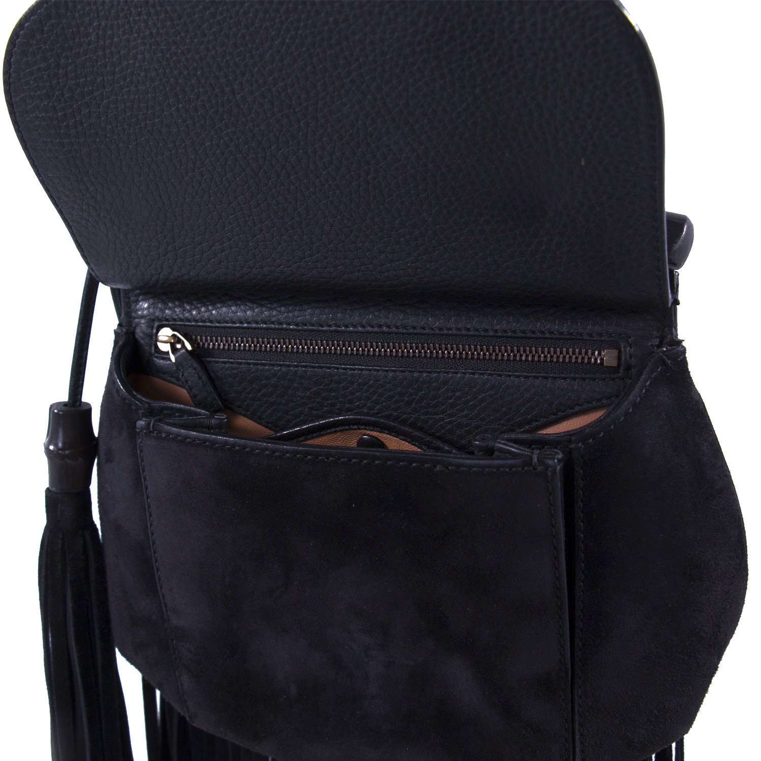Details: Black Suede / Metal Hardware / Adjustable Flat Shoulder Strap / Dual Oversize Tassel Adornments / Black Bamboo Top Handle / Tan Interior Leather Lining / Zipper and Flat Pocket at Interior / Flap Closure