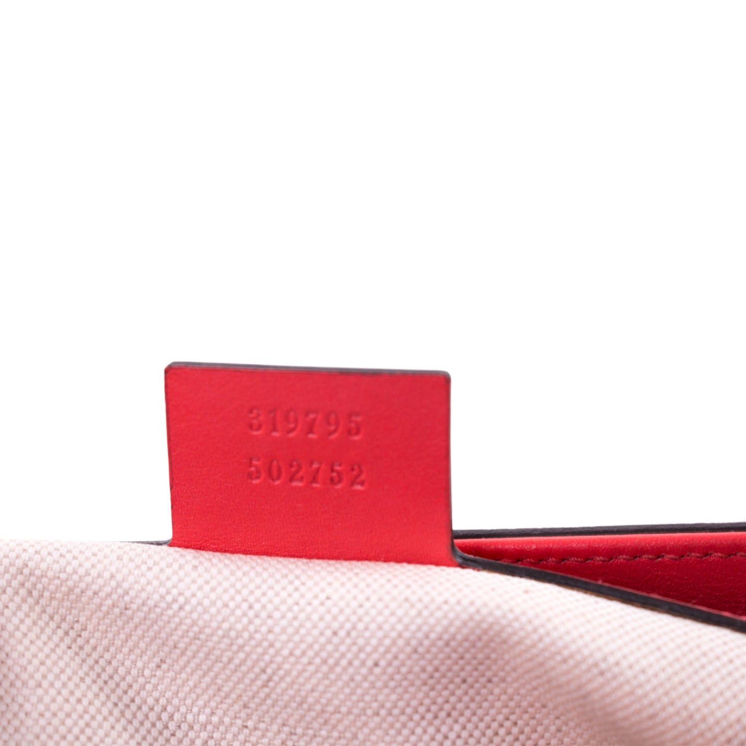 Details: Red Patent Leather / Gold-Tone Hardware / Dual Rolled Handles / Detachable and Adjustable Shoulder Strap / Horsebit Adornment at Front / Beige Canvas Lining / Three Compartments / Four Pockets at Interior, One with Zipper / Open Top