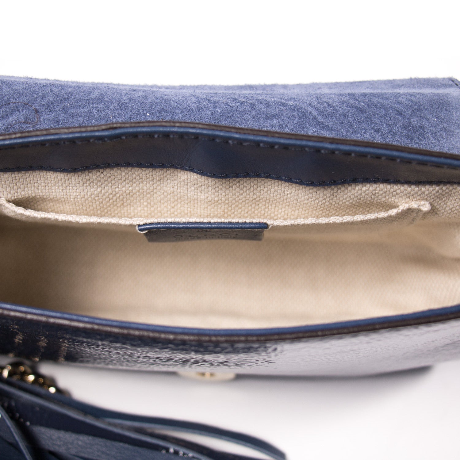Details: Navy Blue Patent Leather / Gold-Tone Hardware / Single Shoulder Strap / Tassel Accent / Interlocking GG Logo Detail At Exterior Front / Beige Canvas Lining At Interior / Single Slit Pocket At Interior Wall / Magnetic Snap Closure At Front Flap