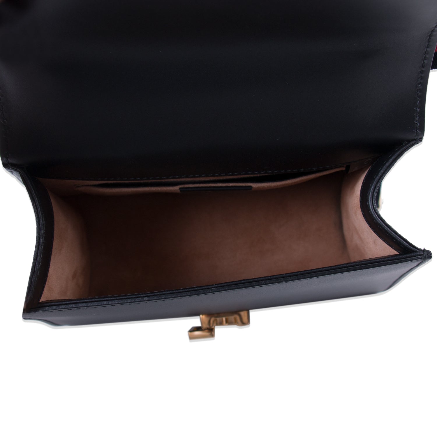 Details: Black Smooth Leather / Gold-Tone Hardware / Grosgrain Sylvie Web Bow with Gold-Ton Ends with Stars / Metal Chain on Top of the Green and Red Web Fabric Detail / Chain Shoulder Strap / Suede Interior Lining / One Compartment and Flat Pocket at Inside / Buckle Closure at Front Flap