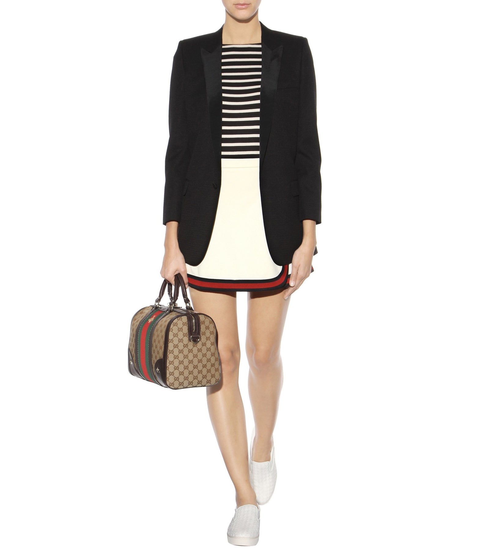 Details: Beige Ebony And Dark Brown Coated Canvas / GG Supreme Motif With Red And Green Stripes / Brown Calf Leather Trim / Two Stars Studs and And Embroidered Bee From The Front / Detachable Removable Shoulder Strap / Dual Rolled Handles / Beige Fabric Interior Lining / Single Zip Pocket And Dual Slit Pockets At Interior / Zip Closure At Top / Protective Studs At Base