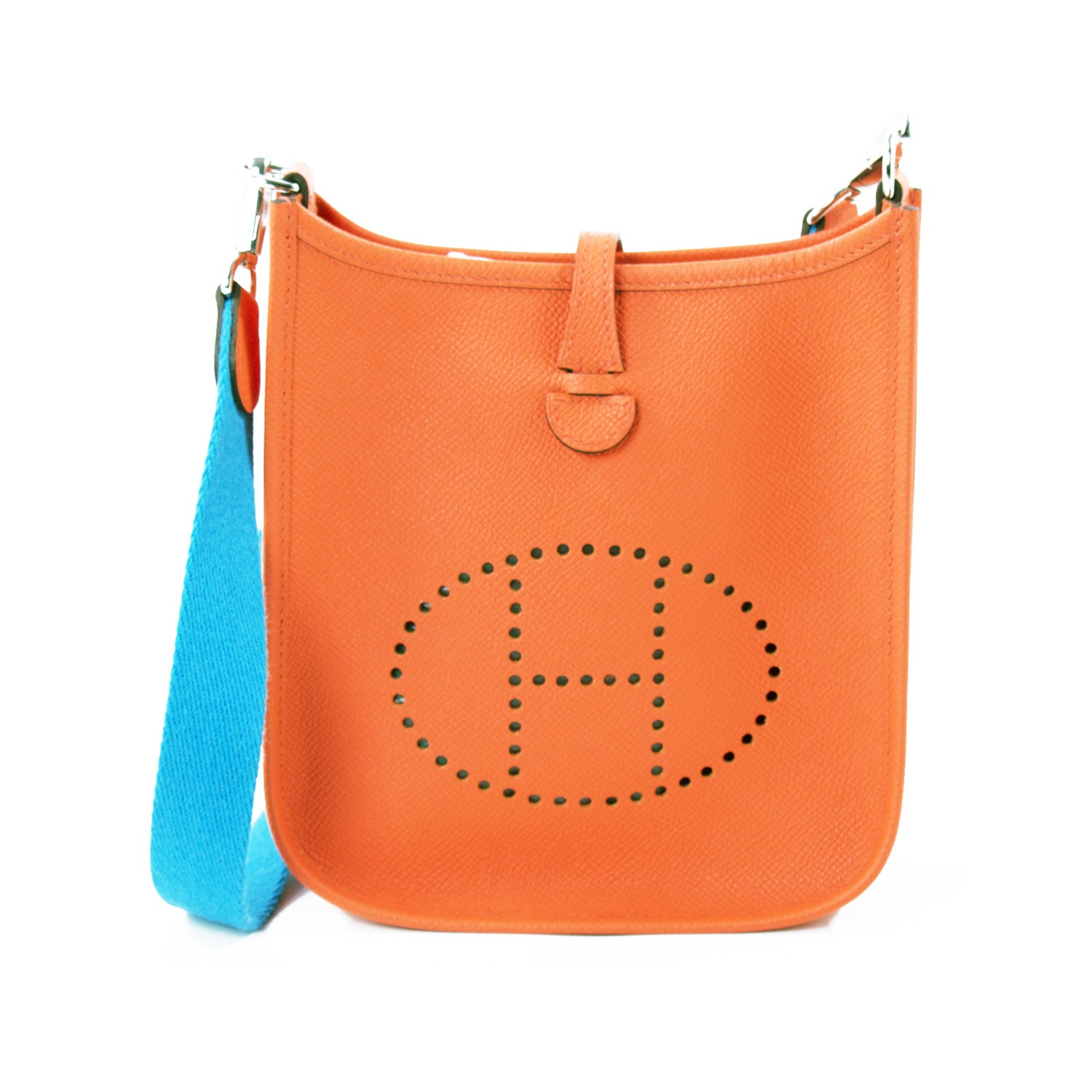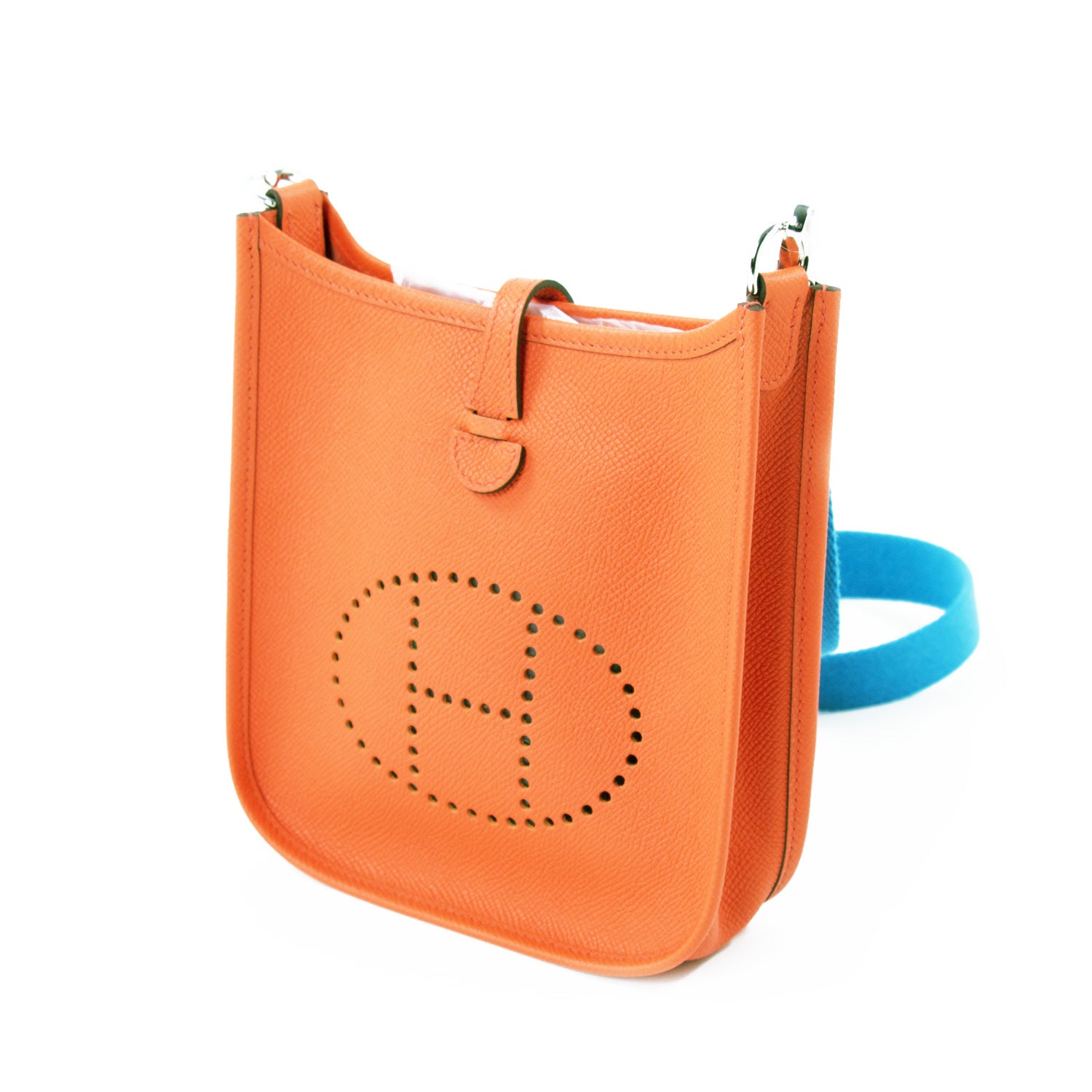 Details: Feu Orange Epsom Leather / Palladium Hardware / Bicolor Shoulder Strap (Blue Zanzibar and Orange) / Large Perforated H Icon In Circle At Front / Snap Closure at Back
