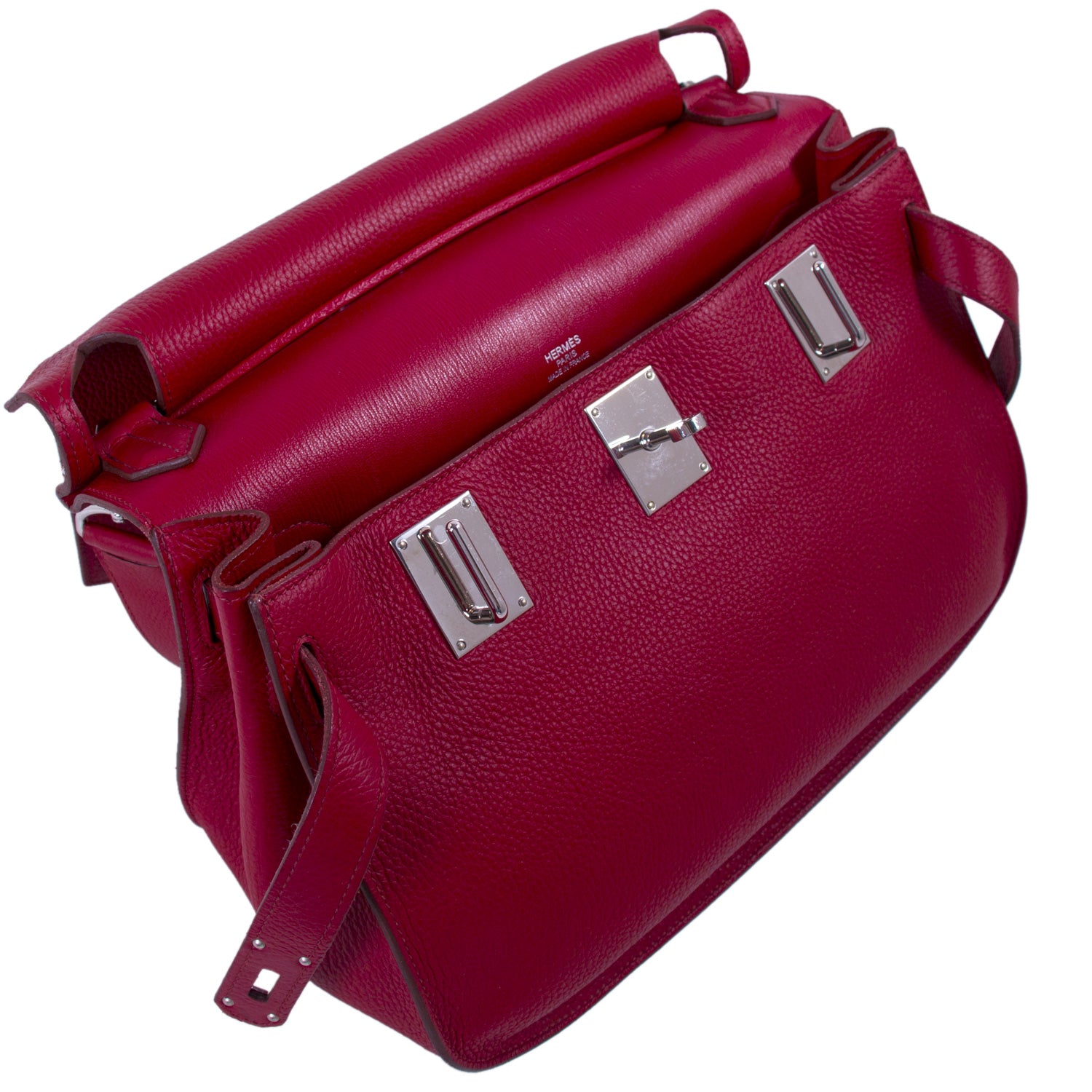 Details: Ruby Red Clemence Leather / Palladium Hardware / Detachable Adjustable Shoulder Strap / Single Compartment with Zipper Pocket and Two Flat Pockets / Pull-Through with Turn-Lock Closure at Front Flap
