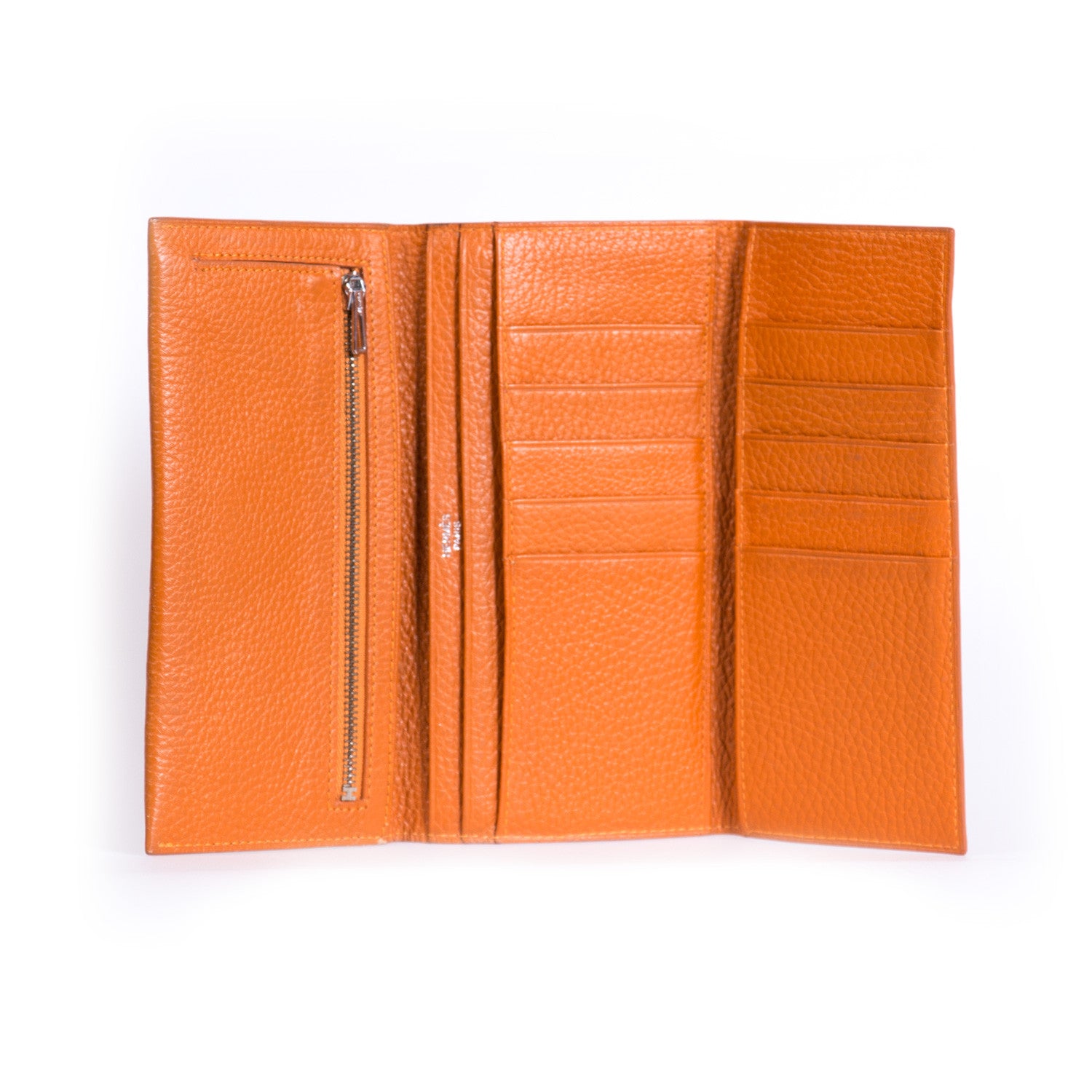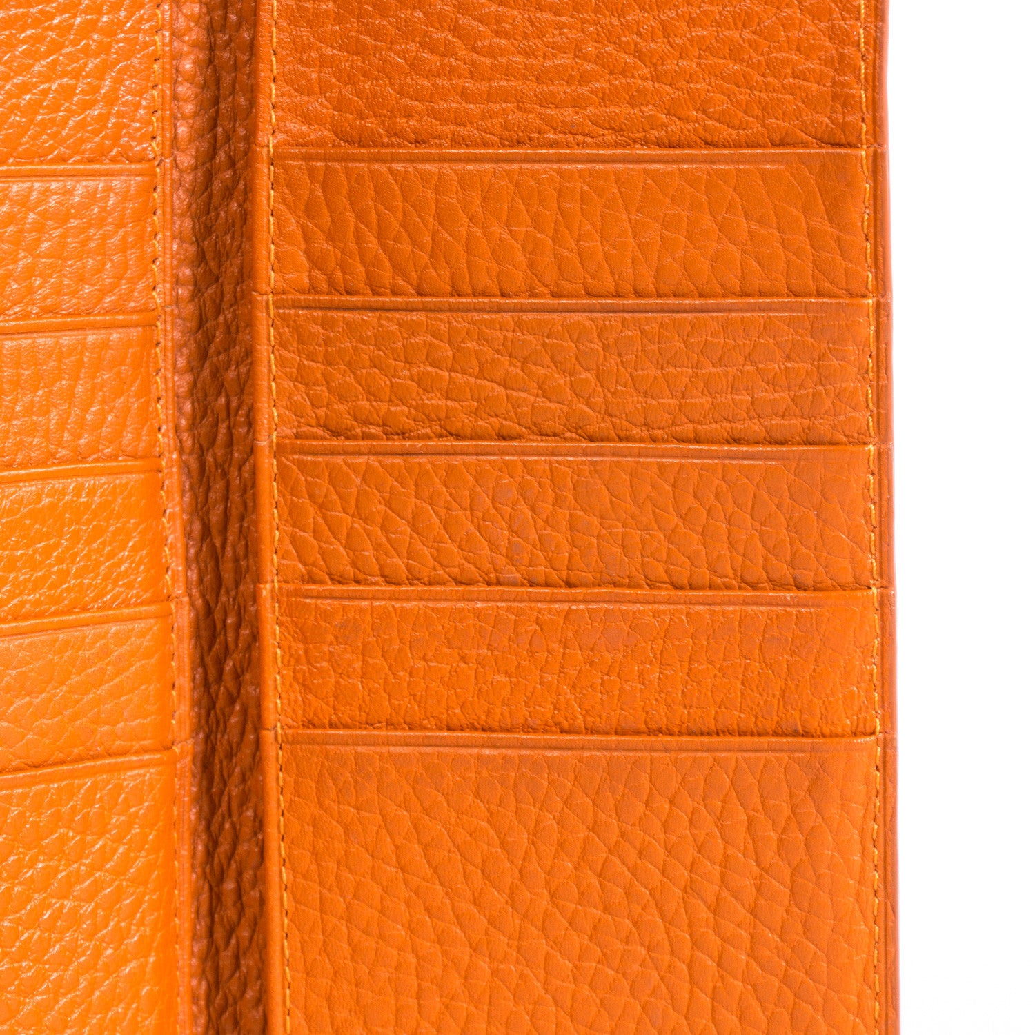 Details: Orange Epsom Leather / Palladium Hardware / Tonal Stitching Throughout / Logo At Front / Orange Epson Leather Lining / Five Bill Compartments / Ten Card Slots / Zip Closure Coin Pouch At Left Interior Wall / Pull-Through Closure At Front Flap