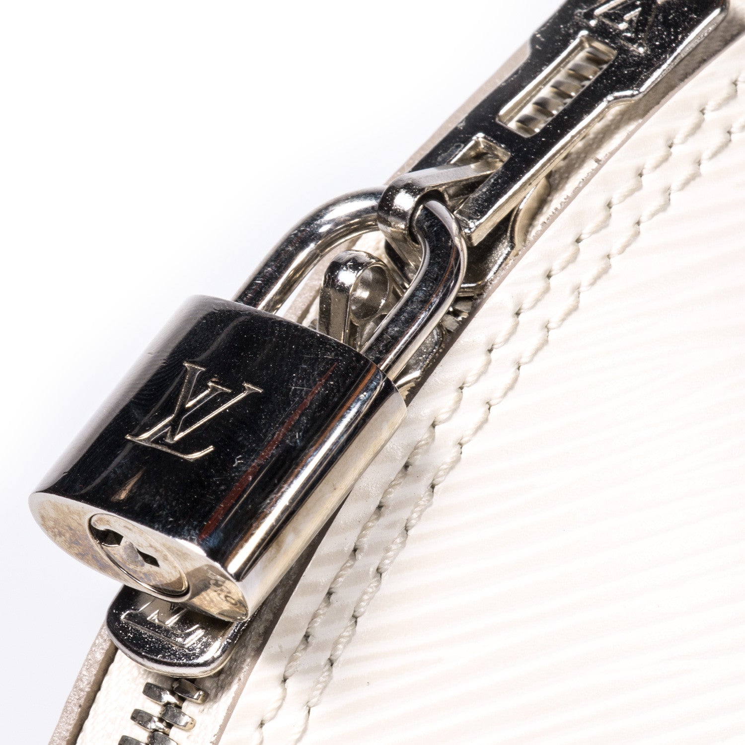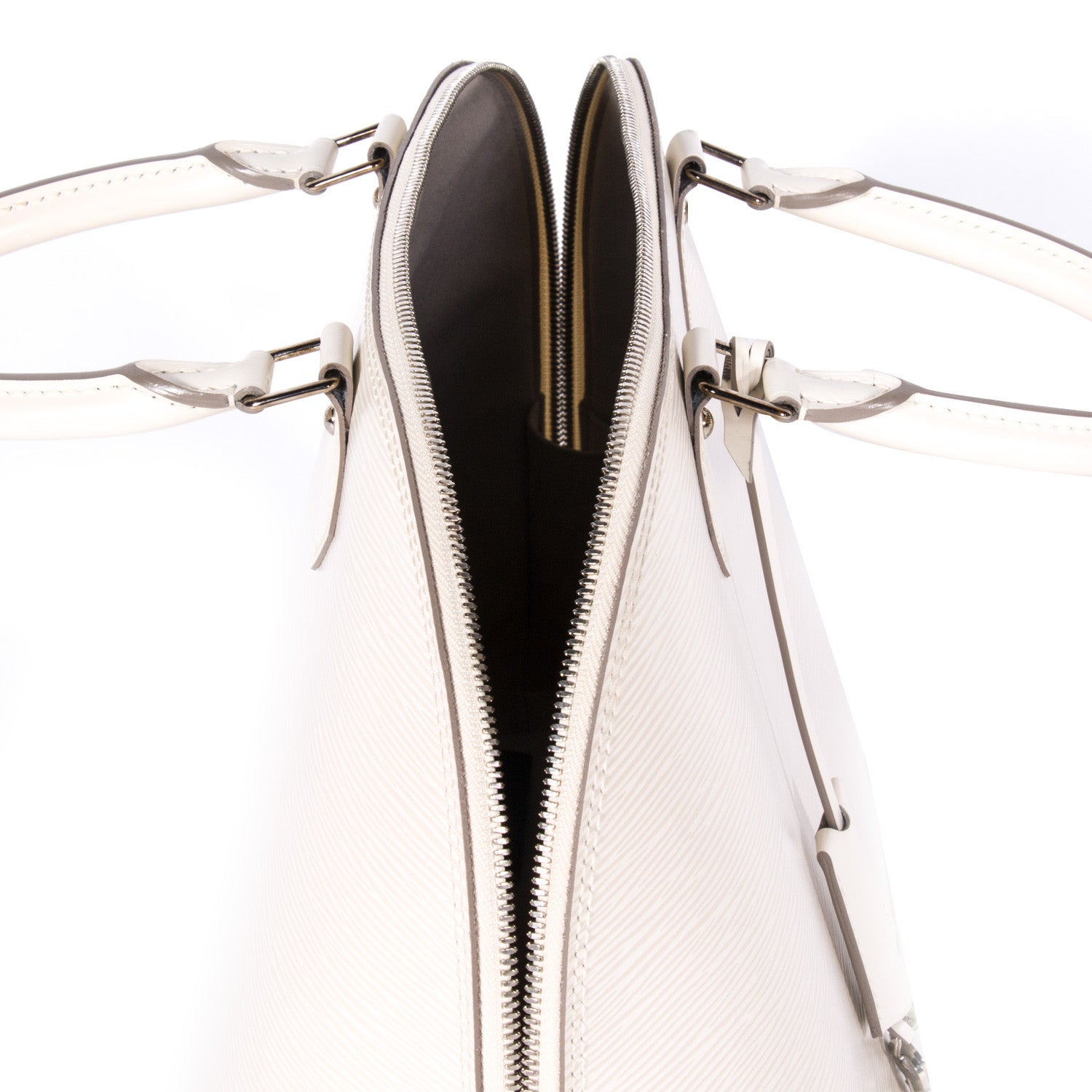 Details: White Epi Leather / Dual Rolled Toron Handles For Comfortable Hand Carry / One Interior Large Pocket / Two Smartphone Pockets / Double Zip Opening For Easy Access / Silver Color Metallic Hardware / Silver Lock and Two Keys /