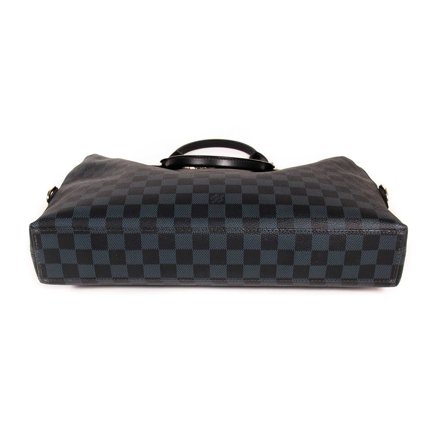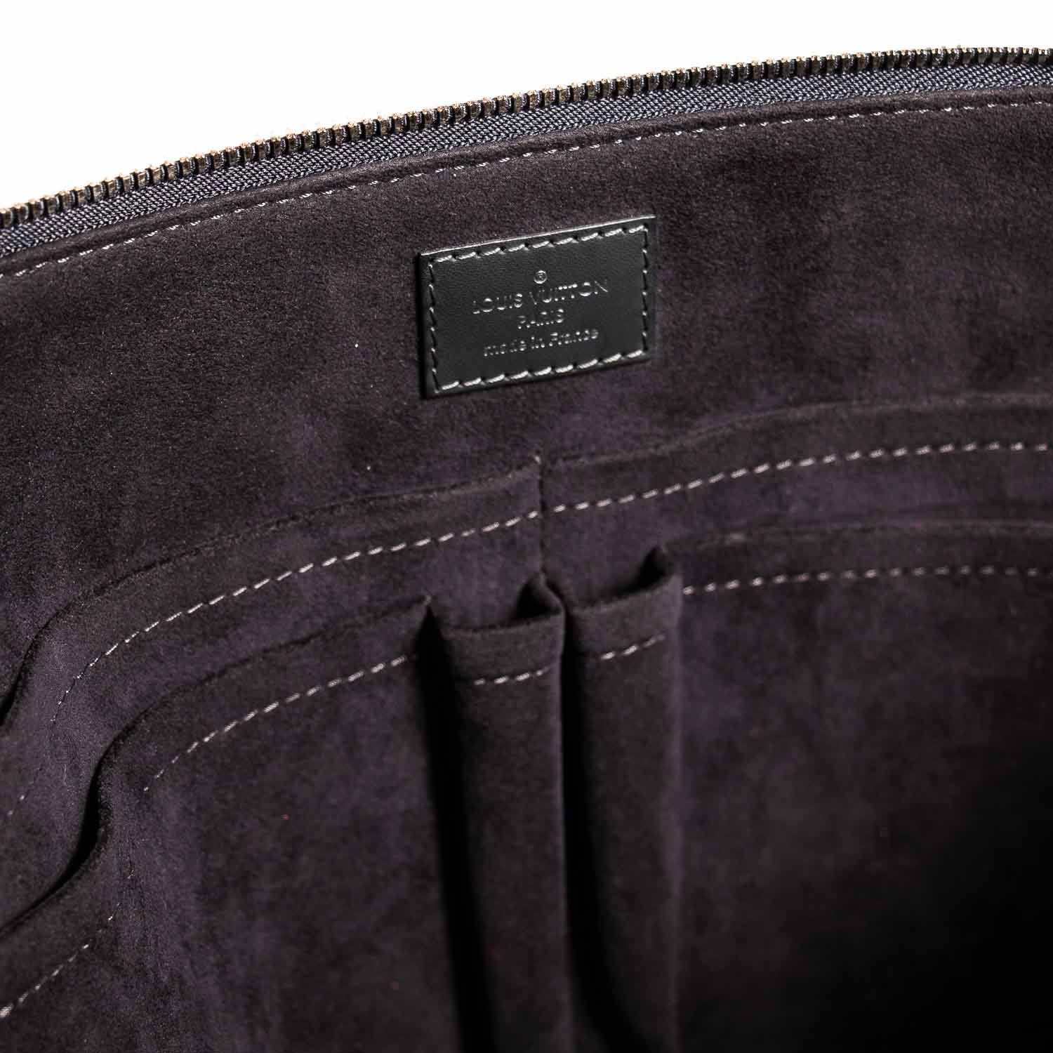 Details: Black and Blue Damier Graphite Coated Canvas / Silver-Tone Hardware / Dual Rolled Handles / Black Leather Trim / Black Alcantara Lining / 1 Compartment and 5 Interior Pockets / Zip Closure at Top