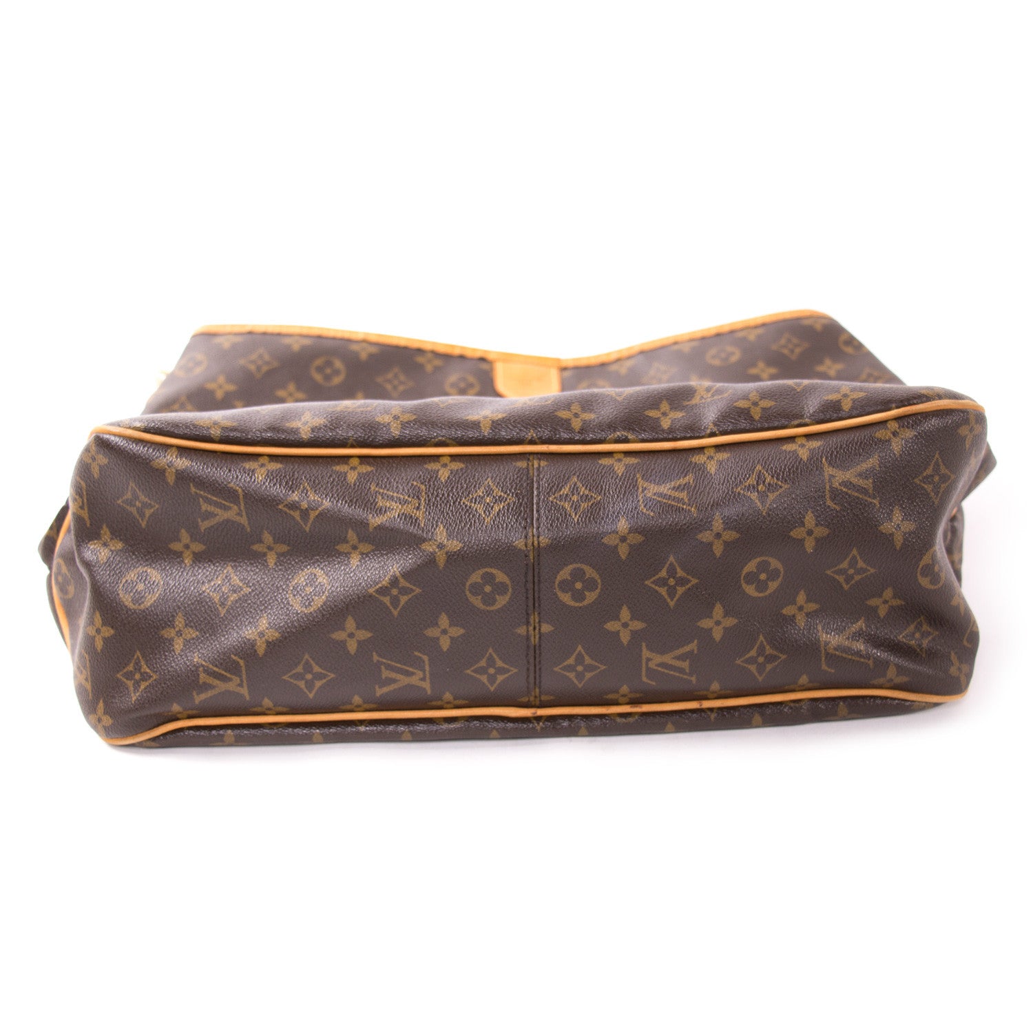 Details: Brown And Tan Monogram Coated Canvas / Brass Hardware / Tan Vachetta Leather Trim / Single Shoulder Strap / Single Compartment / Single Zip Pocket At Interior / Beige/Brown Striped Canvas Lining / Clasp Closure At Top