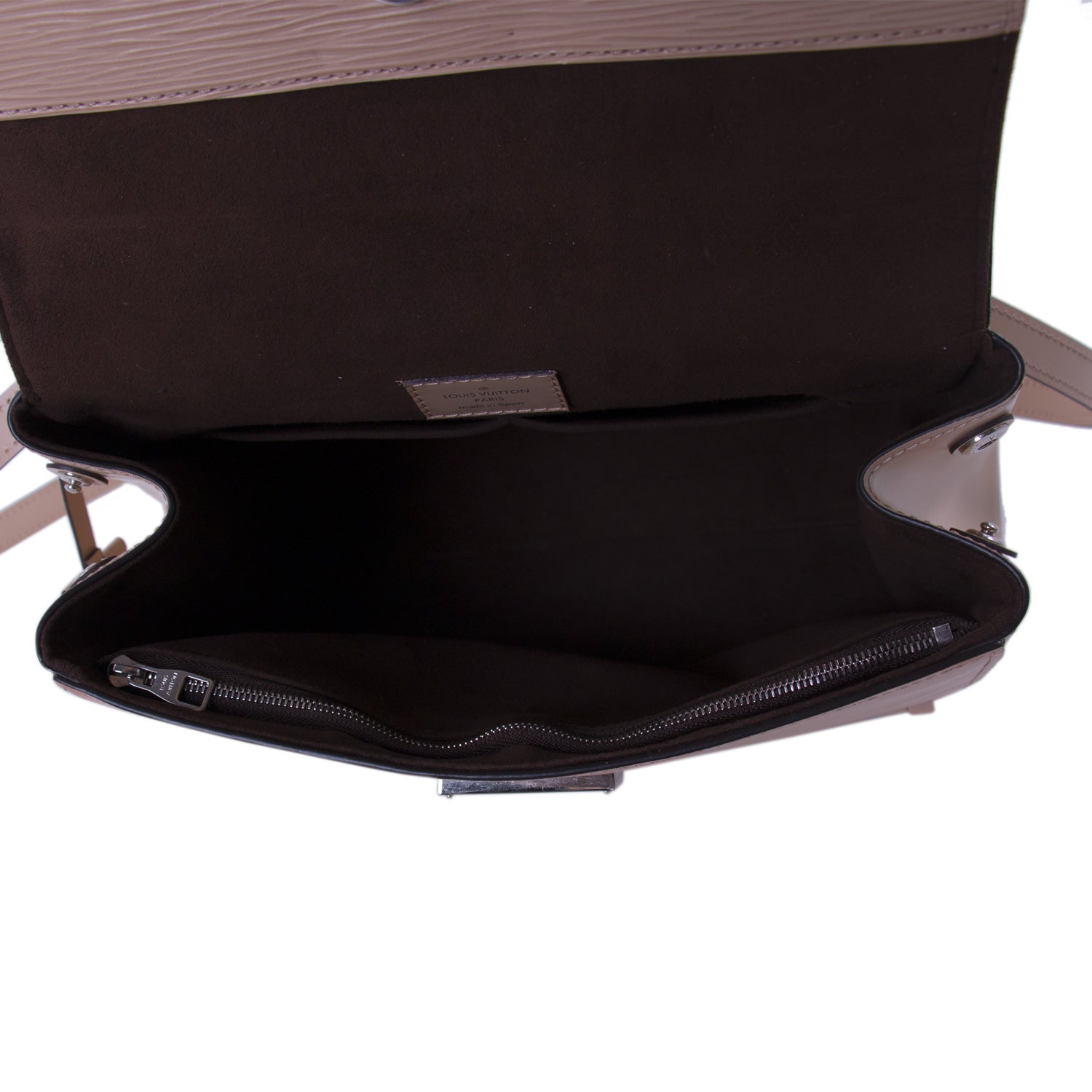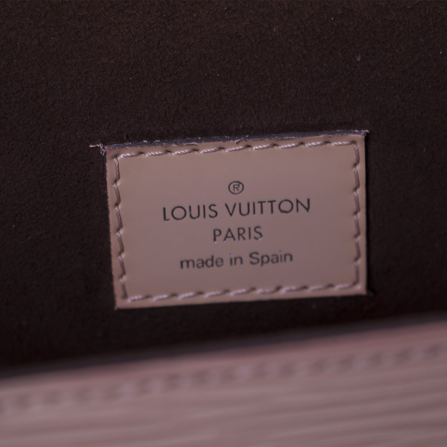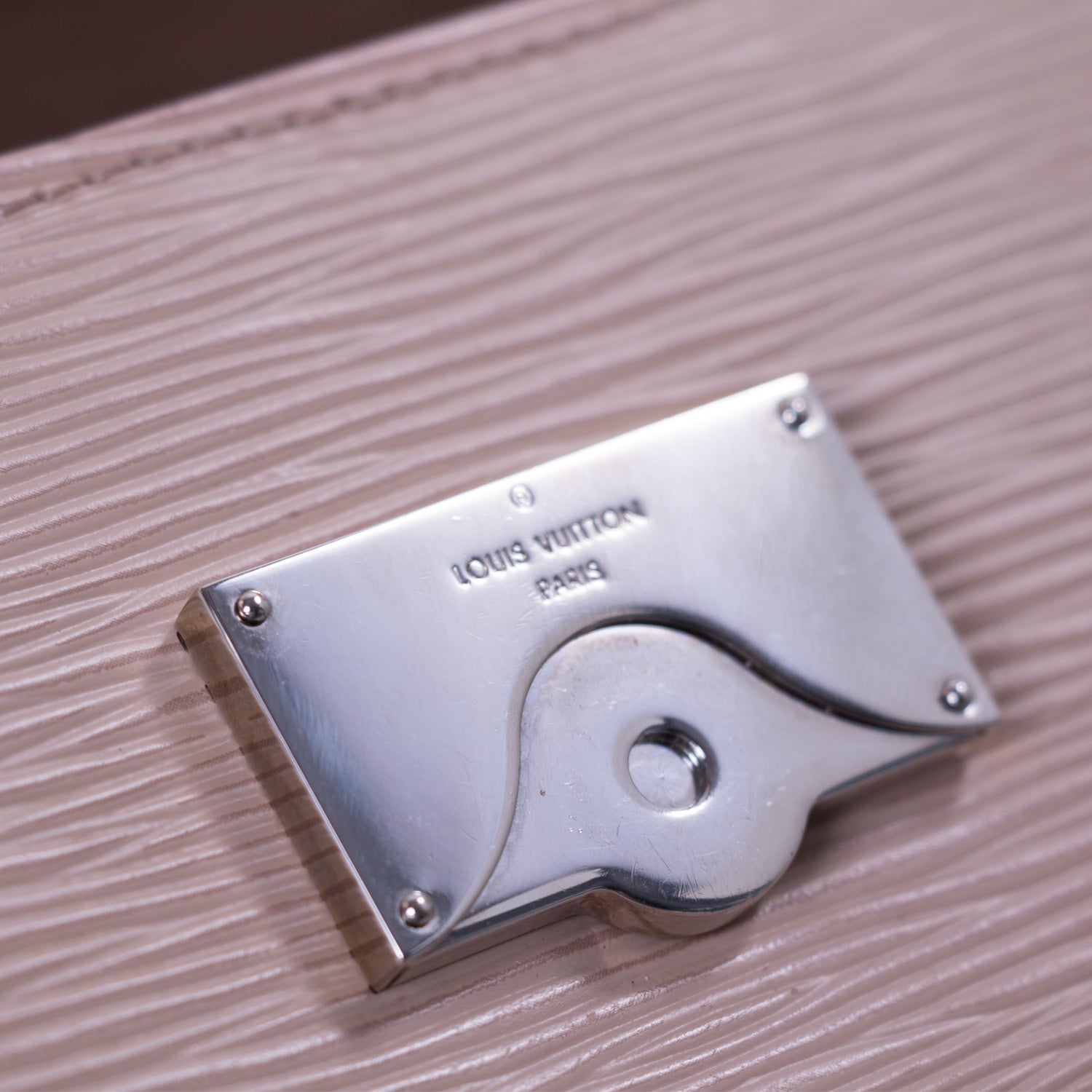 Details: Rose Nacre Epi Leather / Silver-Tone Hardware / Single Rolled Handle / Detachable Shoulder Strap / Black Leather Trim / Brown Alcantara Lining / Dual Slit Pockets and One Zipper Pocket / Magnetic Closure at Front Flap