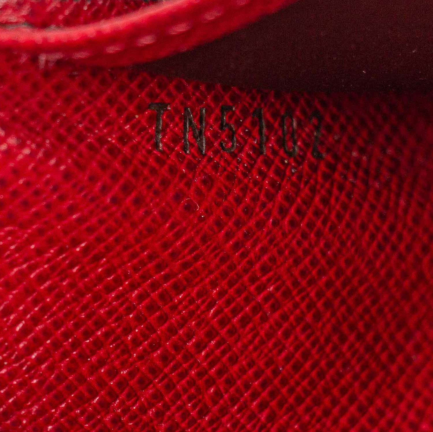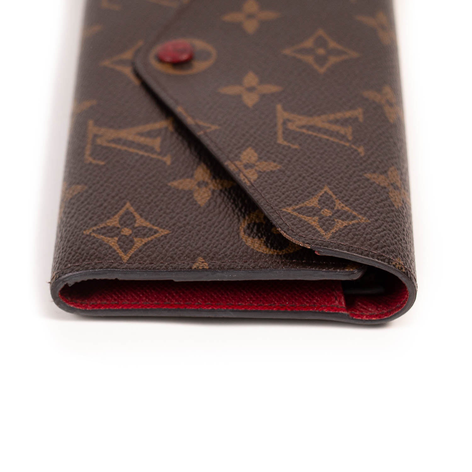 Details: Brown Monogram and Red Coated Canvas / Leather Trimming / Four Card Slots / Removable Zip Pocket / Bill ID and Notes Compartment / Stud Closure at Front