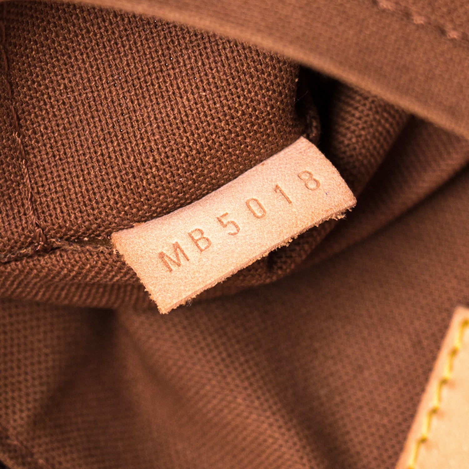 Details: Monogram Coated Canvas / Brass Hardware / Adjustable Shoulder Strap with Leather Pad / Tan Vachetta Leather Trim / Exterior Pocket at Front with Turn-Lock Closure / Brown Canvas Lining / Two Slit Pocket at Interior / Zip Closure at Top