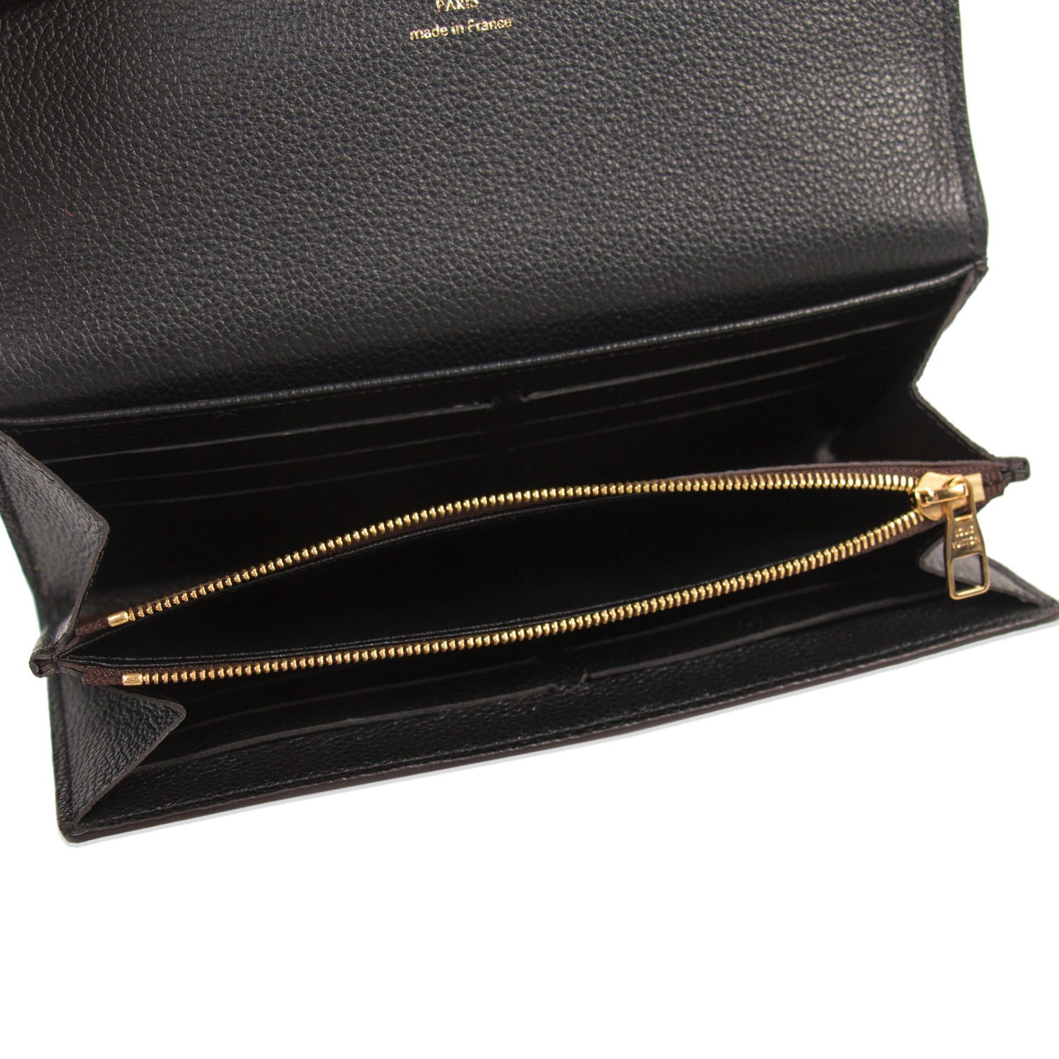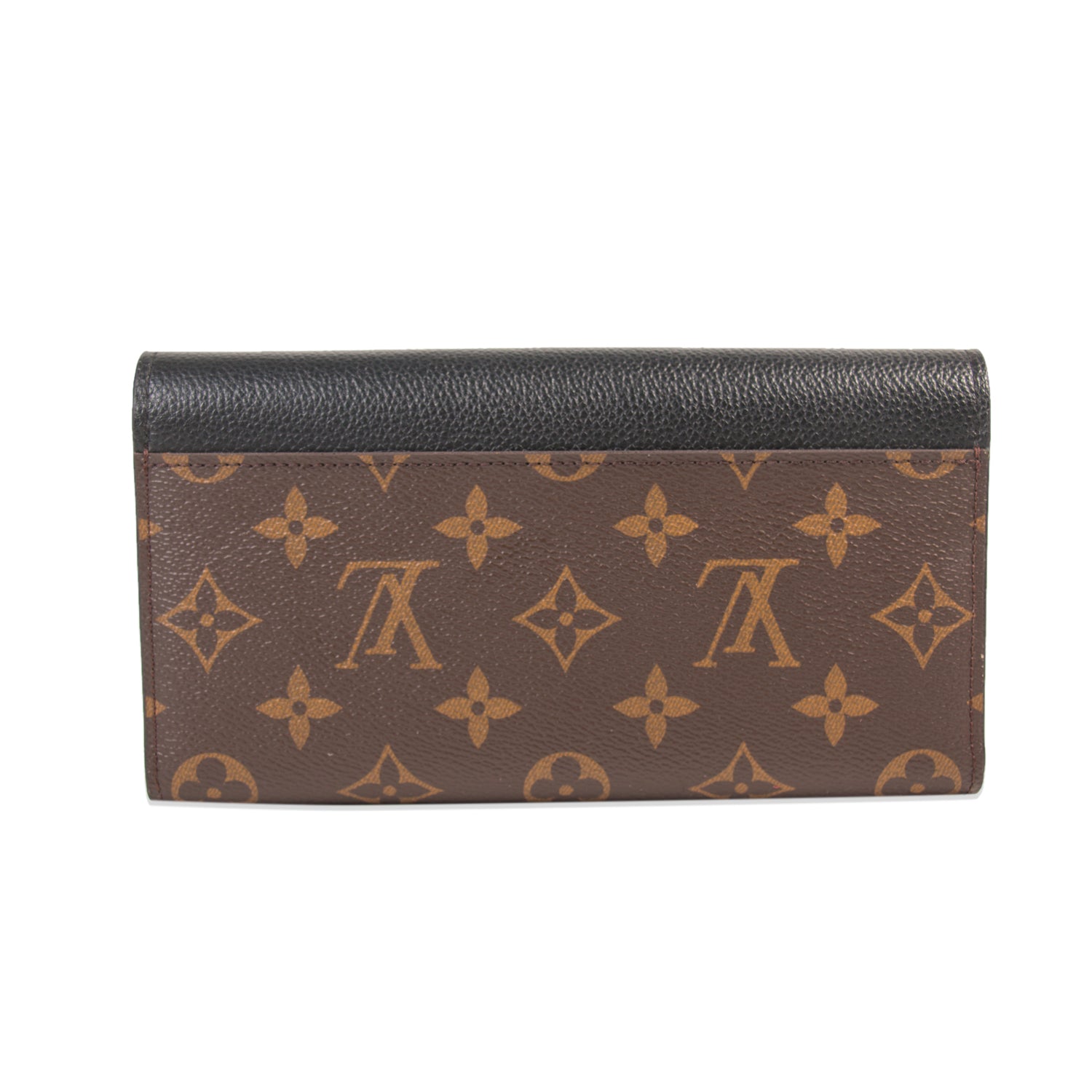 Details: Monogram Coated Canvas and Grained Black Leather / Gold-Tone Hardware / Exterior Pocket at Back / Three Compartments, One with Zipper Closure / 1-Bill Compartment / 16-Card Slot / Push Button Closure at Front Flap