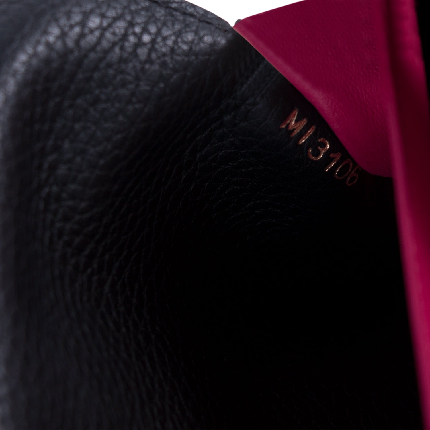 Details: Black Taurillon Leather / Gold-Tone Hardware / Logo at Front Flap / Fuchsia Leather Lining / Three Compartments, One with Zipper Closure / 12-Card Slots / Magnetic Snap Closure at Front Flap