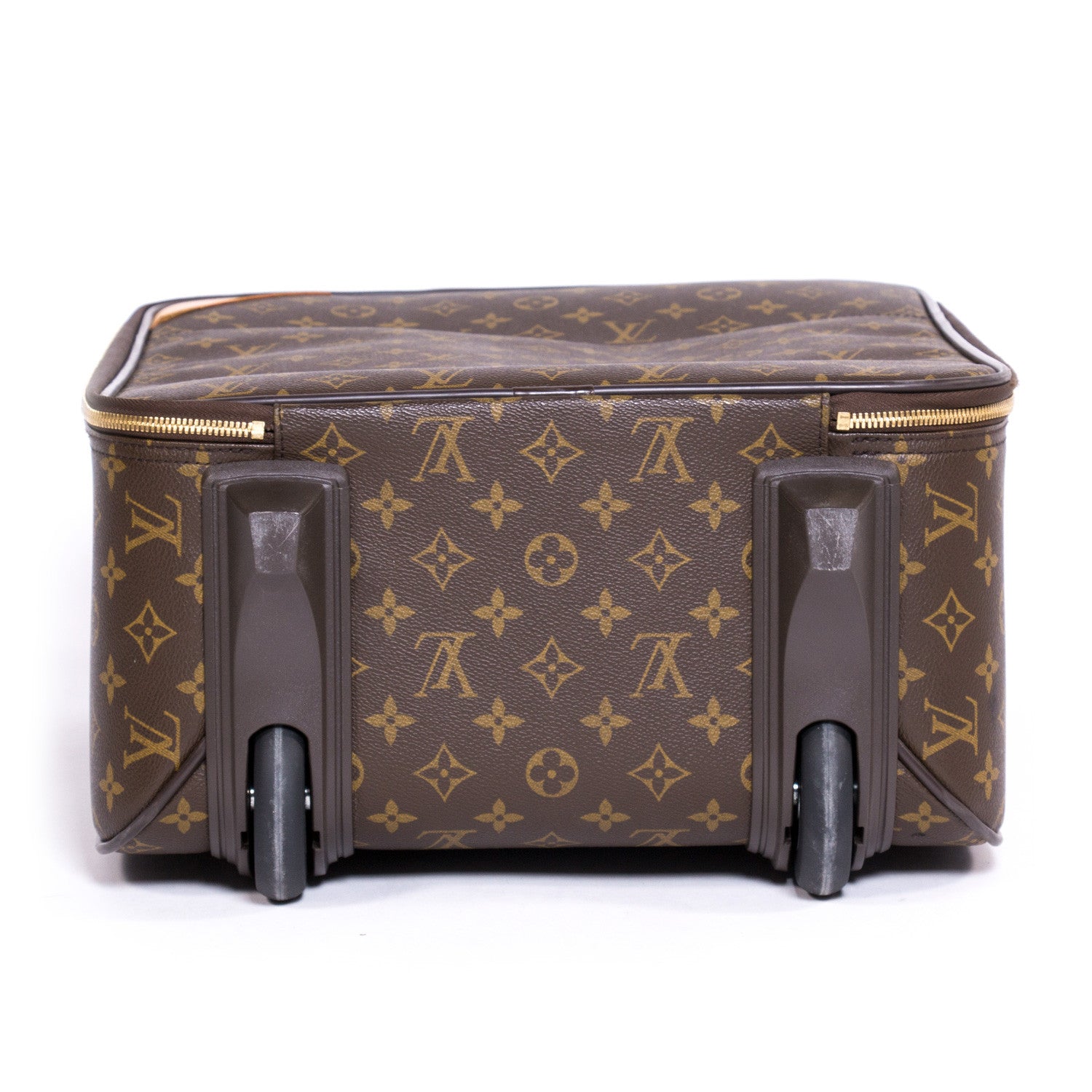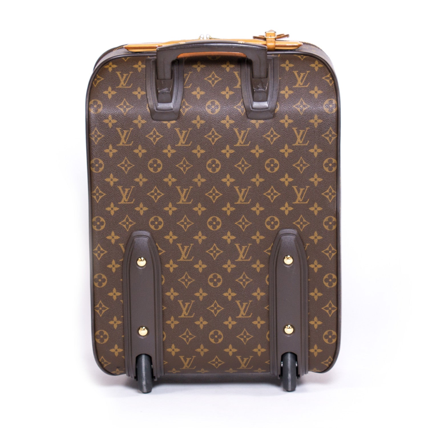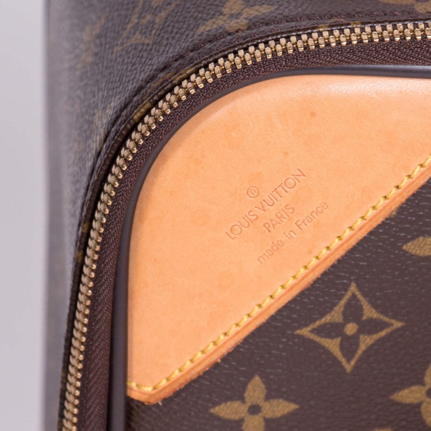 Details: Brown and Tan Monogram Coated Canvas / Brass Hardware / Tan Vachetta Leather Trim / Slit Pocket at Front Face / Brown Nylon Lining / Three Pockets at Interior Walls With Zip Closures / Dual Clothing Separators With Velcro Closures and Zip-Around Closure / Flat Top Handle / Two Level Telescopic Handle / Louis Vuitton Name Tag / Cabin Size