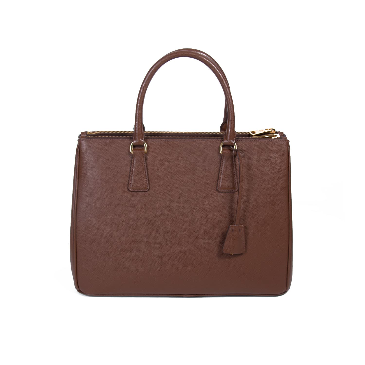 Details: Brown Saffiano Leather / Gold Tone Hardware / Dual Rolled Handles / Adjustable and Removable Shoulder Strap / Dual Zipper Exterior Pocket / Exterior Small Pocket at Front / One Zip Pocket and Three Slit Pocket at Interior