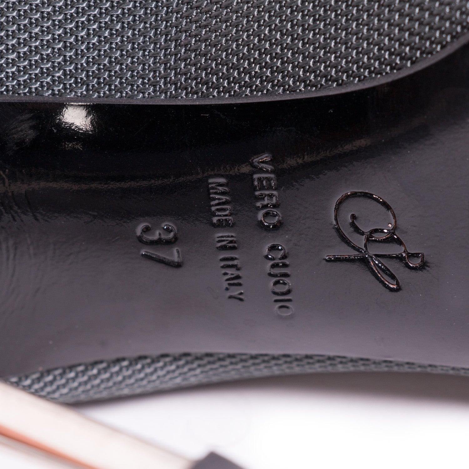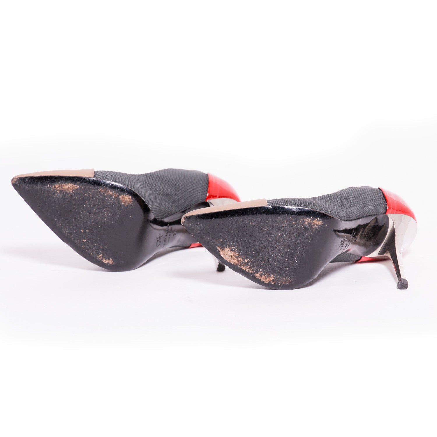 Details: Woven Nylon Pumps With Matt Beige Cap-Toes / Emerald Red Patent Leather Counters and Reflective Heels / Sophisticated Color and Mixed textures / Woven Grey Fabric / Metallic Red Patent Heel Counter / Mirrored Stiletto heel / Leather insole and Sole