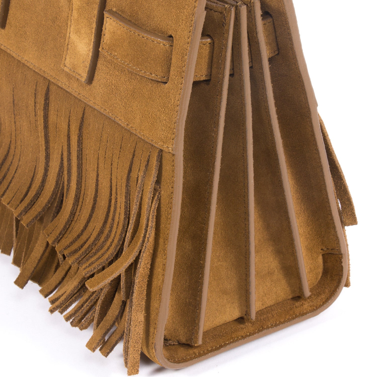 Details: Tan Brown Suede With Fringes / Gold Tone Hardware / Dainty Dual Top Rolled Handles / Adjustable Detachable Shoulder Strap / Black Interior Calf Leather Lining / Open Top / Protective Studs At Base / Single Compartment With Slit Pocket