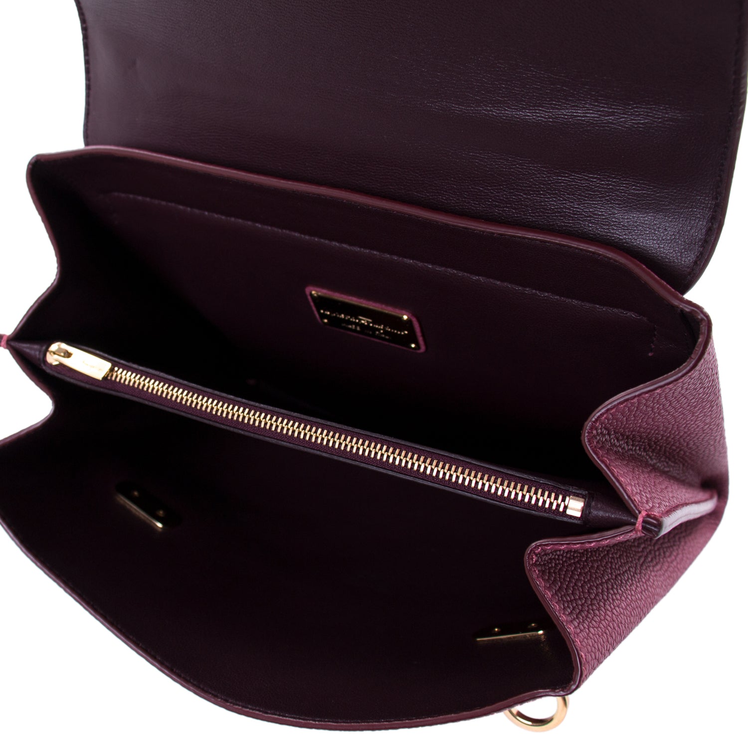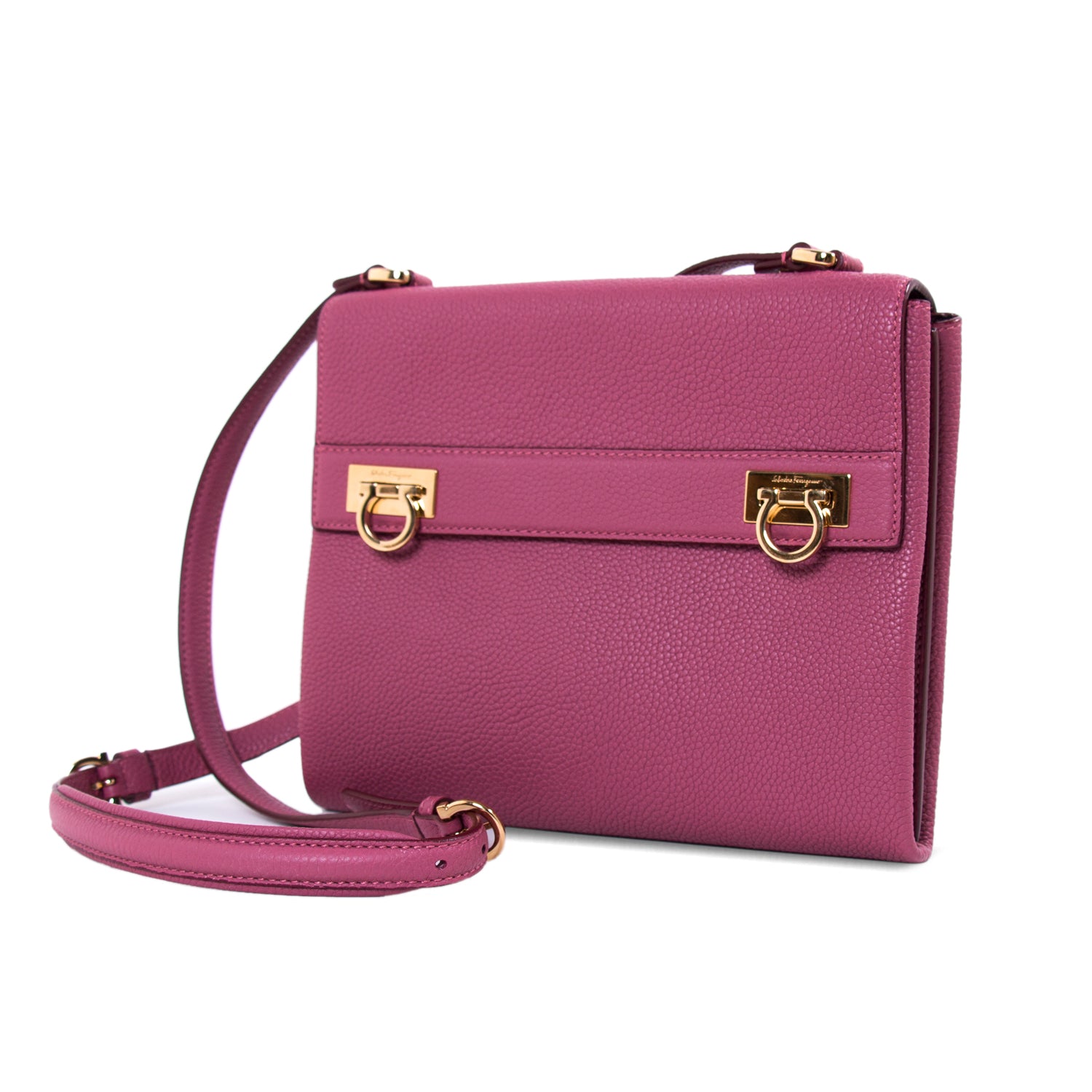 Details: Purple Grained Leather / Gold-Tone Hardware / Adjustable Shoulder Strap / Exterior Zipper Pocket at Back / Chocolate Leather Lining / Three Interior Compartments, One with Zip Closure / Dual Gancio Flip-Lock Closure at Front